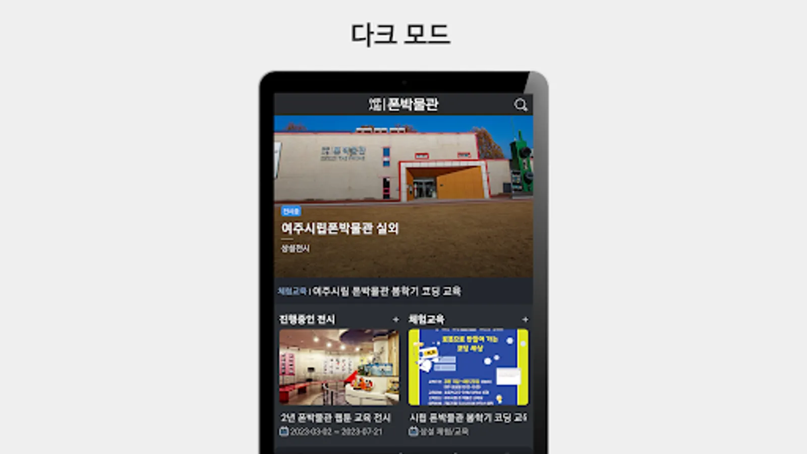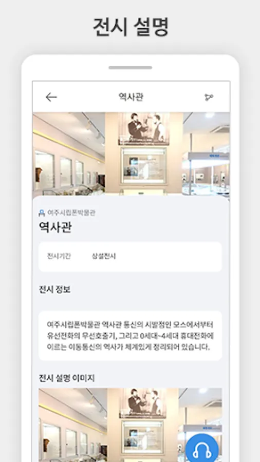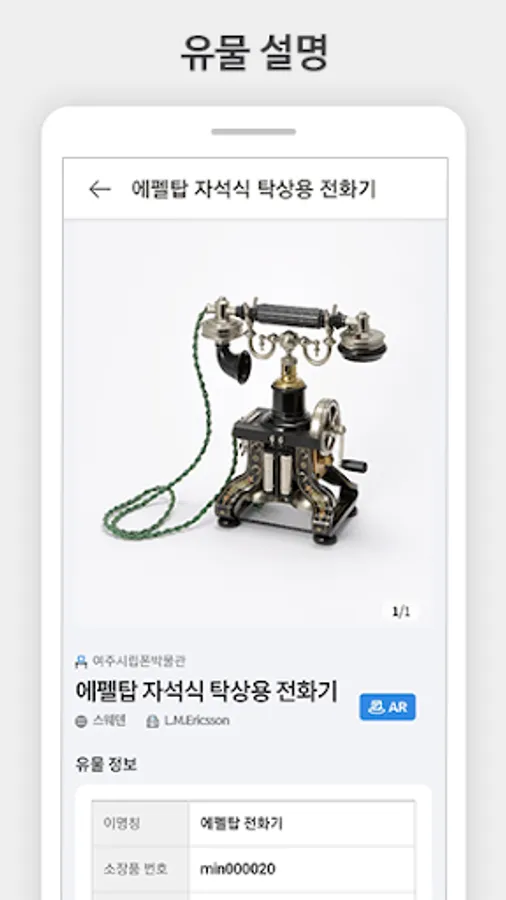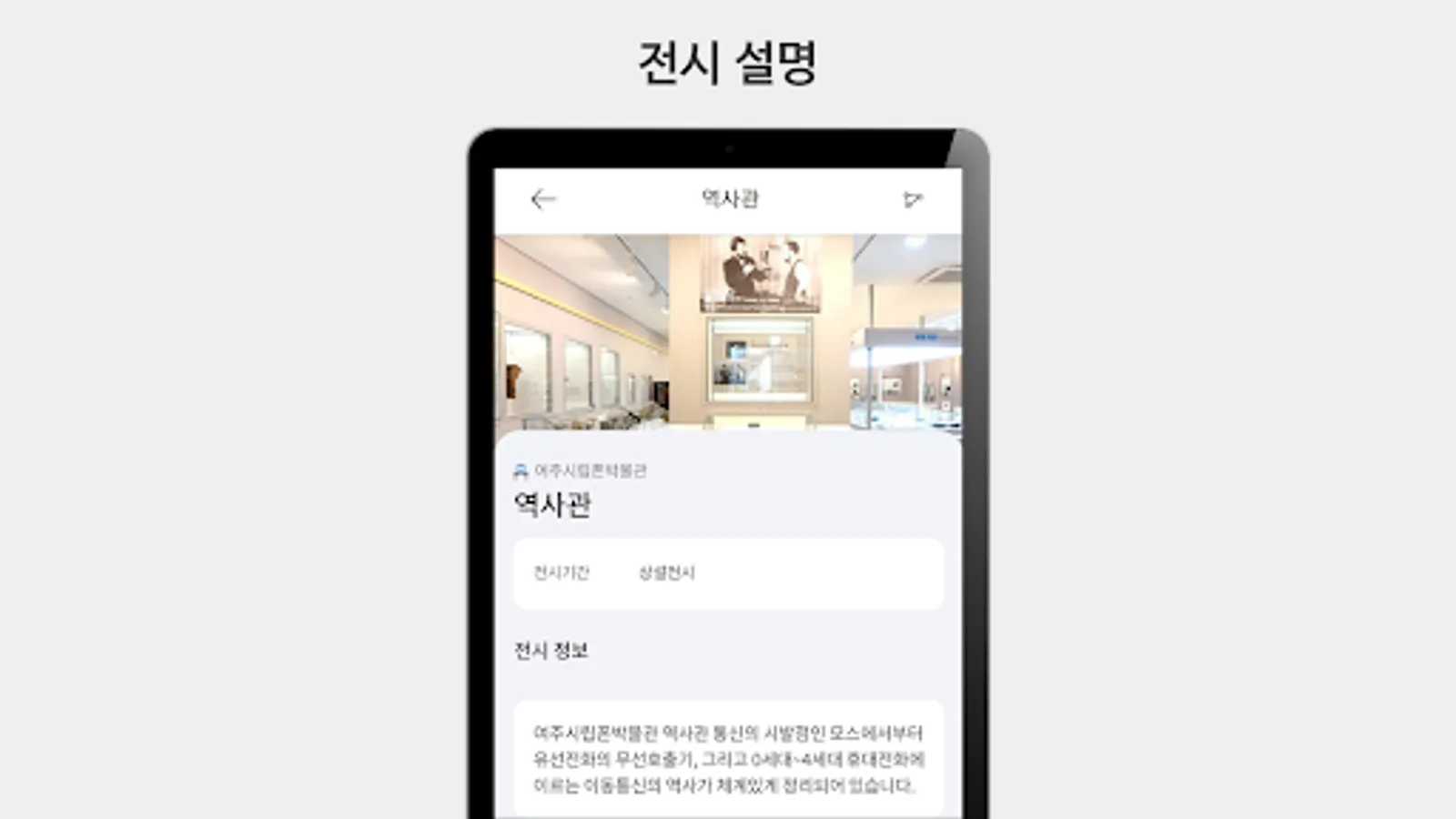 The Yeoju City Phone Museum app uses indoor positioning technology to automatically use the exhibition voice guidance service, and you can easily search for artifacts simply by shooting with a smartphone camera. In addition, new exhibition contents using augmented reality (AR) and virtual reality (VR) are prepared. In the children's mode, you can easily and happily visit the museum through experiential services such as the collection of relics and the phone OX/quadruple quiz.