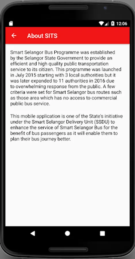 This mobile application is one of the Selangor state's initiative under the Smart Selangor Delivery Unit (SSDU) to enhance the service of Smart Selangor Bus for the benefit of bus passengers as it will enable them to plan their bus journey better. User of the application would be able to access all the Free Bus information provided by all local councils of Selangor state. Information such as Estimated Time of Arrival is provided for each of the bus stops covered by the Free Bus Service.