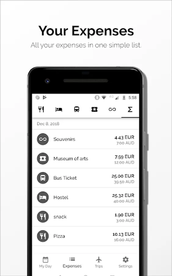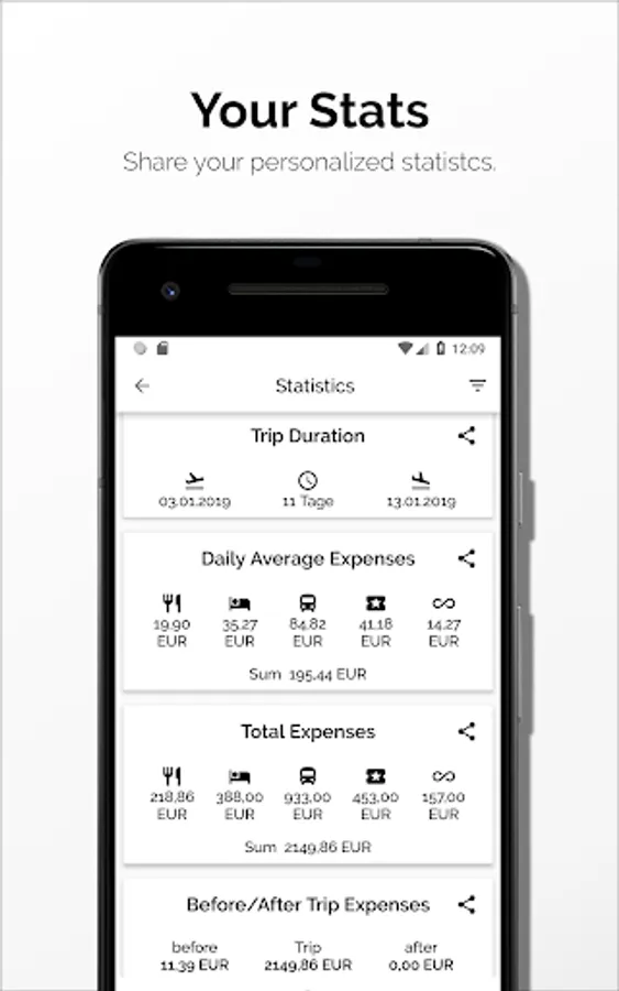 View different statistics of your trip, like average daily costs and share them with your friends and community. Ideal for travel bloggers!