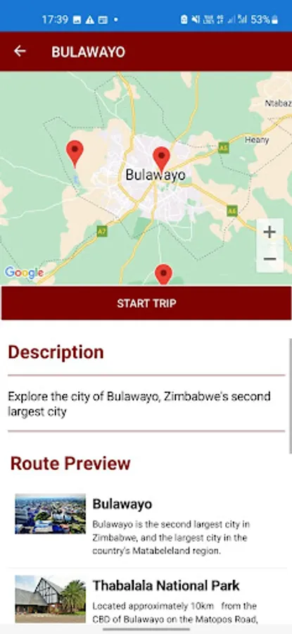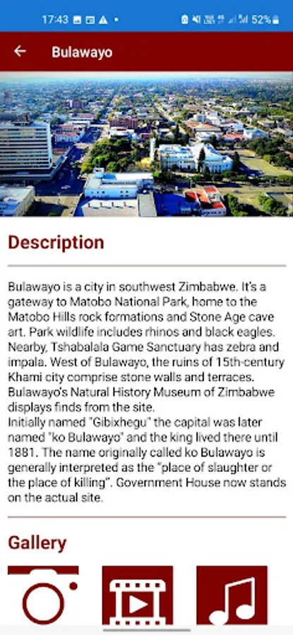 Come Explore Zimbabwe! Visit Zimbabwe - Bulawayo is a virtual tour guide app of the Zimbabwean city, Bulawayo’s most fascinating and exciting tourist points of interest. The app uses the GPS location on the tourist’s phone to guide them through a determined route to the point of interest. While they travel, tourists are educated and entertained as the app provides them with historical facts about Bulawayo, its wars, agriculture, people, music, etc. The Visit Zimbabwe - Bulawayo app allows tourists to plan their visit well in advance and gives them information on where they can find lodging, food, bathrooms, and other important travel provisions while they navigate through the beauty of Bulawayo.