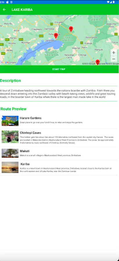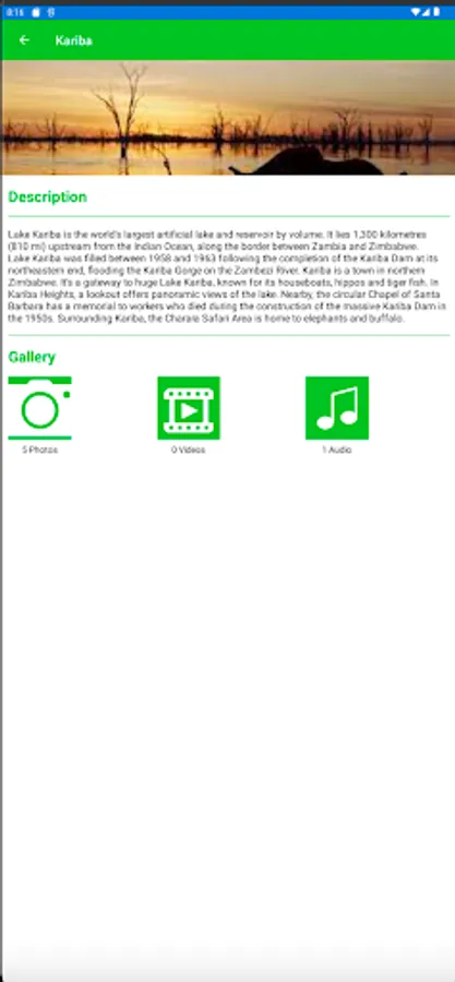 Come Explore Zimbabwe! Visit Zimbabwe - Kariba is a virtual tour guide app of the Zimbabwean city, Kariba’s most fascinating and exciting tourist points of interest. The app uses the GPS location on the tourist’s phone to guide them through a determined route to the point of interest. While they travel, tourists are educated and entertained as the app provides them with historical facts about Kariba, its wars, agriculture, people, music, etc. The Visit Zimbabwe - Kariba app allows tourists to plan their visit well in advance and gives them information on where they can find lodging, food, bathrooms, and other important travel provisions while they navigate through the beauty of Kariba.