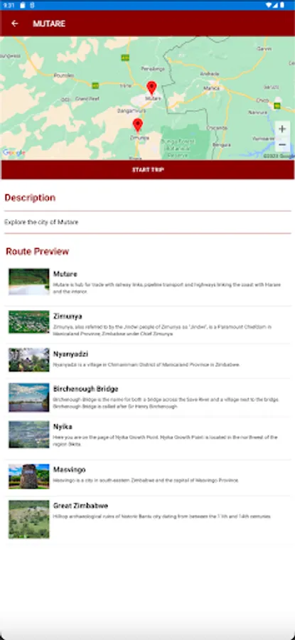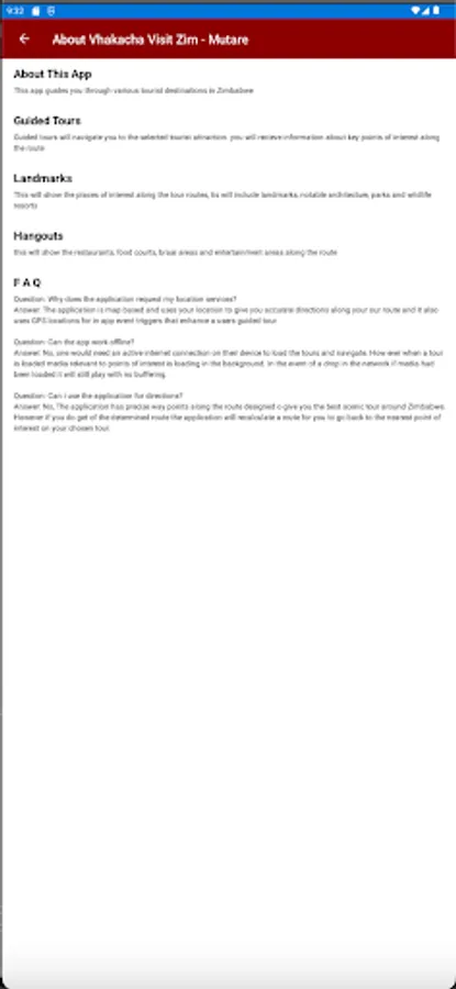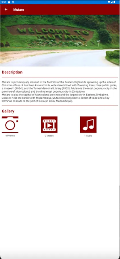 Come Explore Zimbabwe! Visit Zimbabwe - Mutare is a virtual tour guide app of the Zimbabwean city, Mutare’s most fascinating and exciting tourist points of interest. The app uses the GPS location on the tourist’s phone to guide them through a determined route to the point of interest. While they travel, tourists are educated and entertained as the app provides them with historical facts about Mutare, its wars, agriculture, people, music, etc. The Visit Zimbabwe - Mutare app allows tourists to plan their visit well in advance and gives them information on where they can find lodging, food, bathrooms, and other important travel provisions while they navigate through the beauty of Mutare.