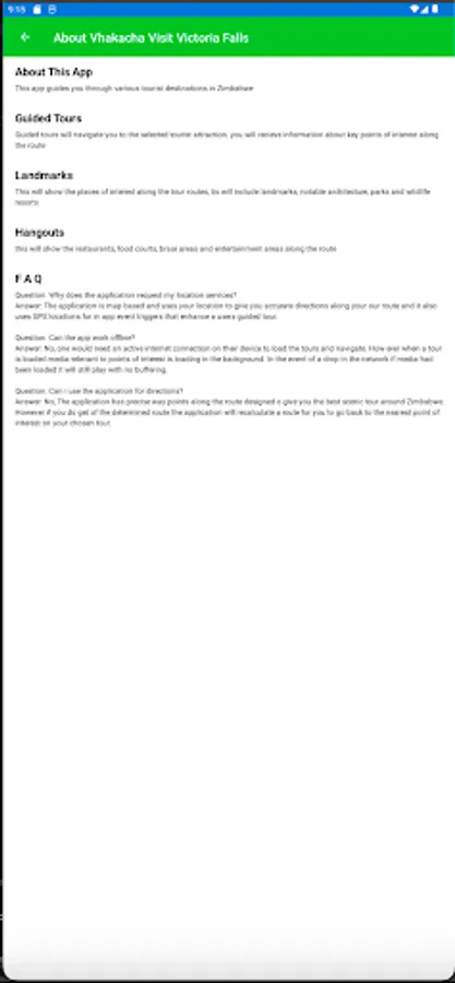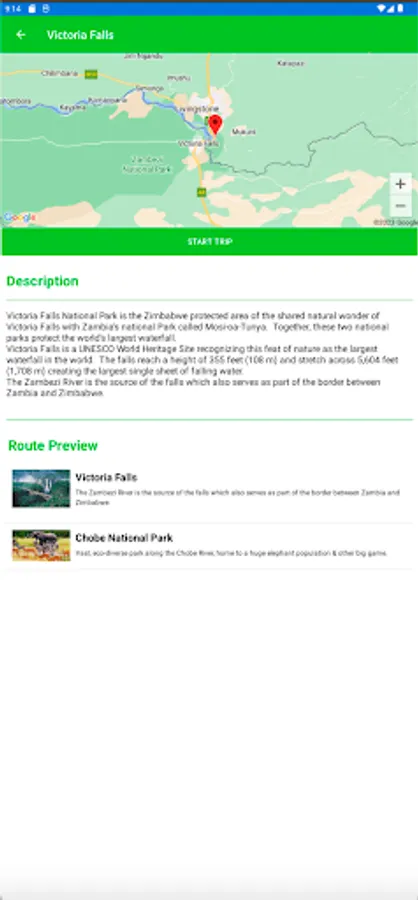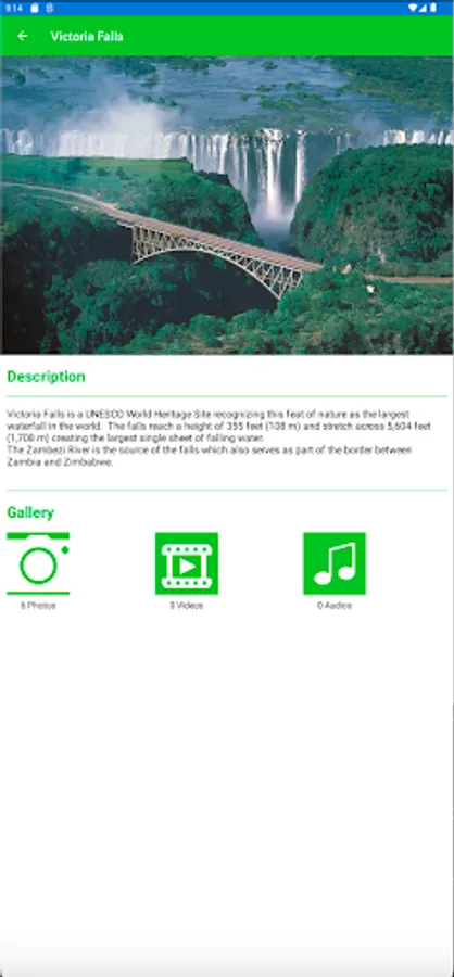 Come Explore Zimbabwe! Visit Zimbabwe - Victoria Falls is a virtual tour guide app of the Zimbabwean city, Victoria Falls’s most fascinating and exciting tourist points of interest. The app uses the GPS location on the tourist’s phone to guide them through a determined route to the point of interest. While they travel, tourists are educated and entertained as the app provides them with historical facts about Victoria Falls, its wars, agriculture, people, music, etc. The Visit Zimbabwe - Victoria Falls app allows tourists to plan their visit well in advance and gives them information on where they can find lodging, food, bathrooms, and other important travel provisions while they navigate through the beauty of Victoria Falls.