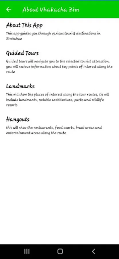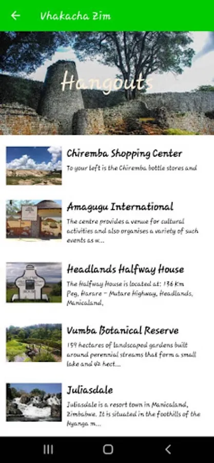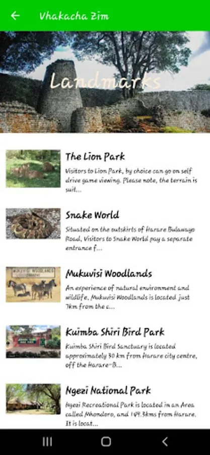 Come Explore Zimbabwe! Vhakacha Visit Zimbabwe is a virtual tour guide app of Zimbabwe’s most fascinating and exciting tourist points of interest. It highlights places like Victoria Falls, Kariba Dam, Hwange National Park, Mana Pools, Matopos, Vumba Mountains, Nyanga, Masvingo, Great Zimbabwe, Epworth Balancing Rocks, Chinhoyi Caves, and more. The app uses the GPS location on the tourist’s phone to guide them through a pre-determined route to the point of interest. While they travel, tourists are educated and entertained as the app provides them with historical facts about Zimbabwe, its wars, agriculture, people, music, etc. The Vhakacha Visit Zimbabwe app allows tourists to plan their visit to Zimbabwe well in advance and gives them information on where they can find lodging, food, bathrooms, and other important travel provisions while they navigate through the beauty of Zimbabwe.