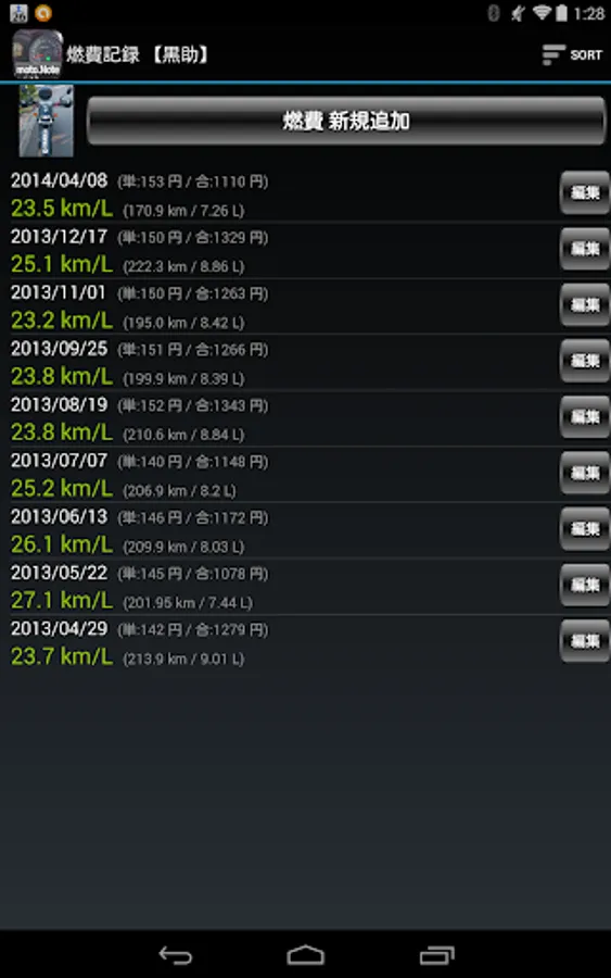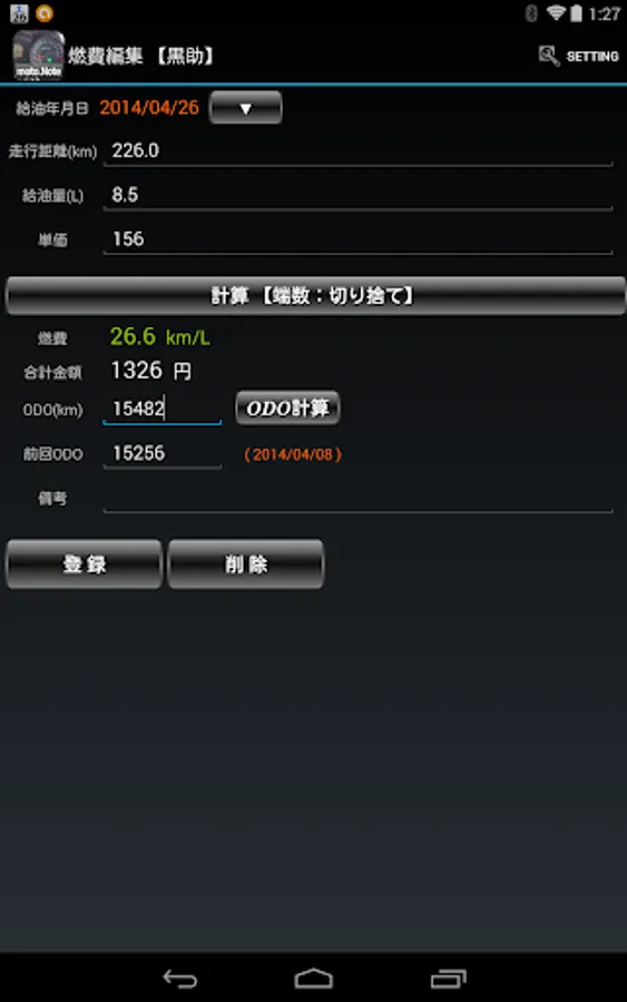 …距離数(TripまたはODO)、給油量、ガソリン単価の入力で燃費やガソリン費用を管理