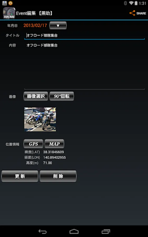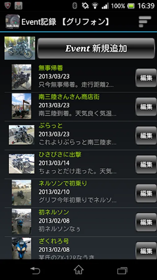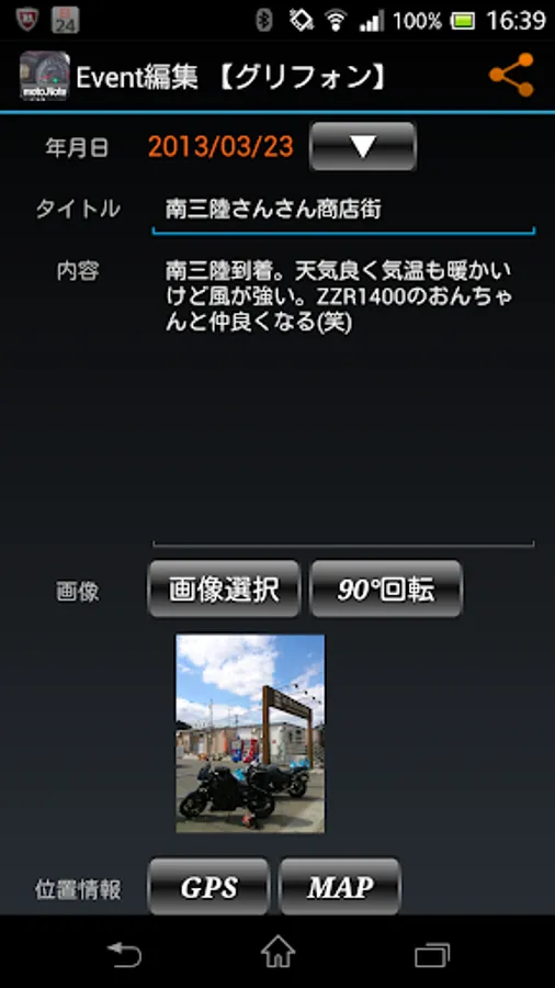 ツーリング先の写真やコメント(感想)、GPS利用による位置情報の保存など想い出の記録として利用できるほか、記録した内容をTwitterやFacebook、mixiやメールなど他のアプリへ共有ができます。