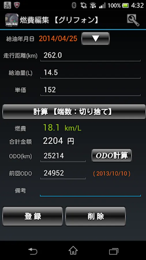 ODO値を入力し「ODO計算」ボタンを押すことで、