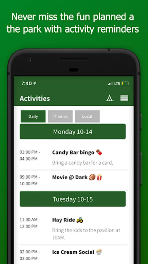 * Access the campground activity schedule and receive activity reminders during your stay.