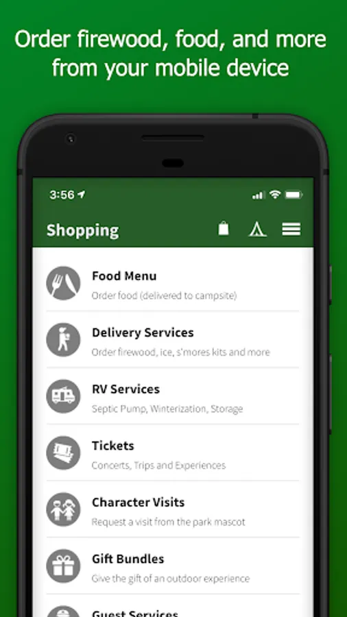 * Mobile camp store - order goods, services and food to be delivered to your campsite or poolside at participating parks.
