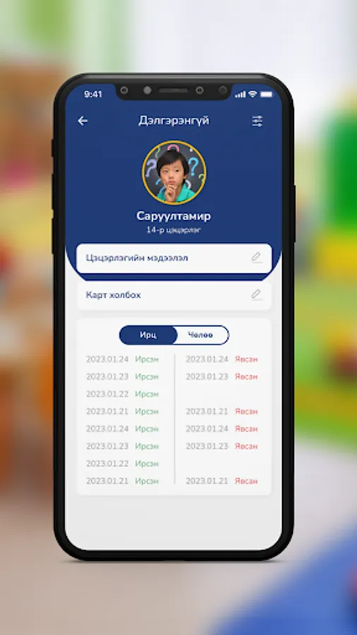 Энэхүү апп нь асран хамгаалагчид цэцэрлэгт хамрагдаж буй хүүхдийн ирж, явах ирцийг бүртгэх зорилготой аппликейшн юм. Тус аппликейшнээр хүүхдийн ирц бүртгүүлэхээс гадна өвчний болон бусад чөлөө авах хүсэлтийг цэцэрлэгт илгээх боломжтой