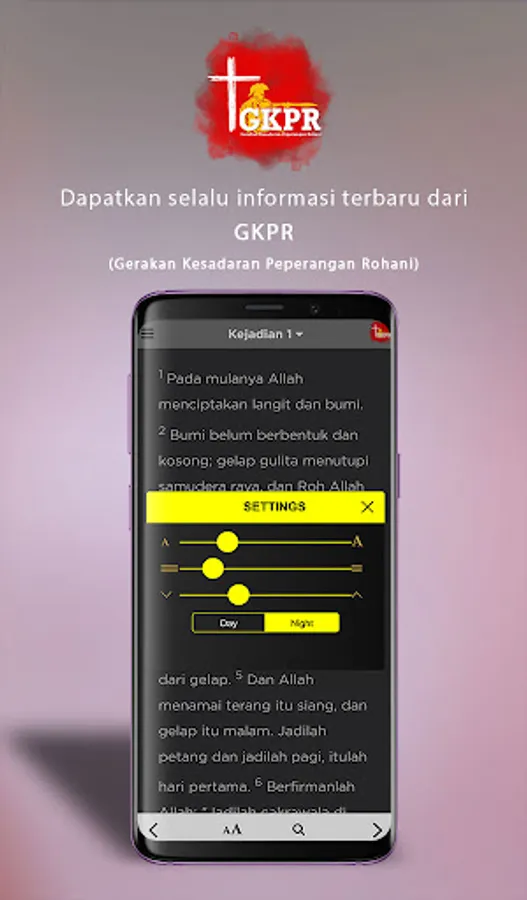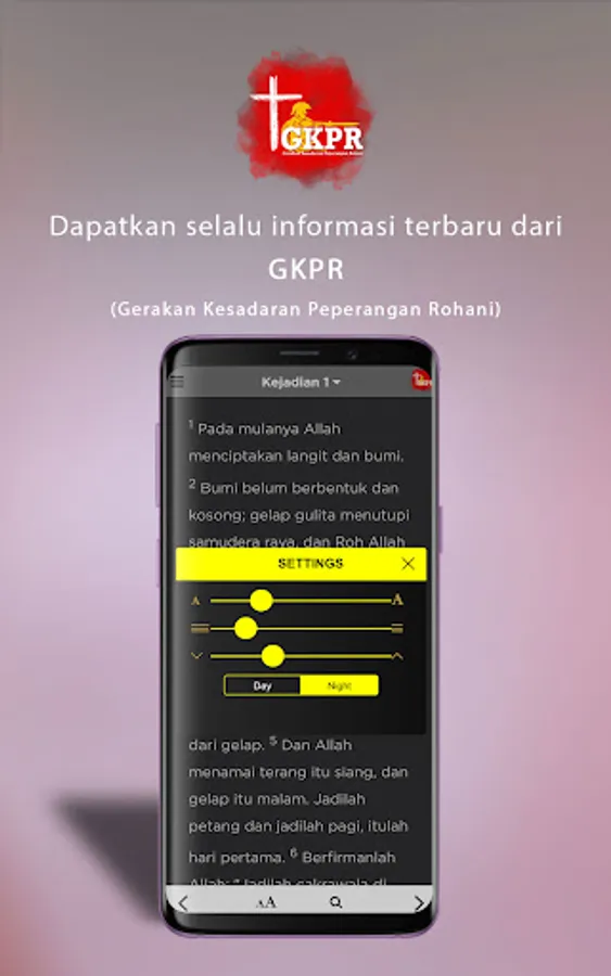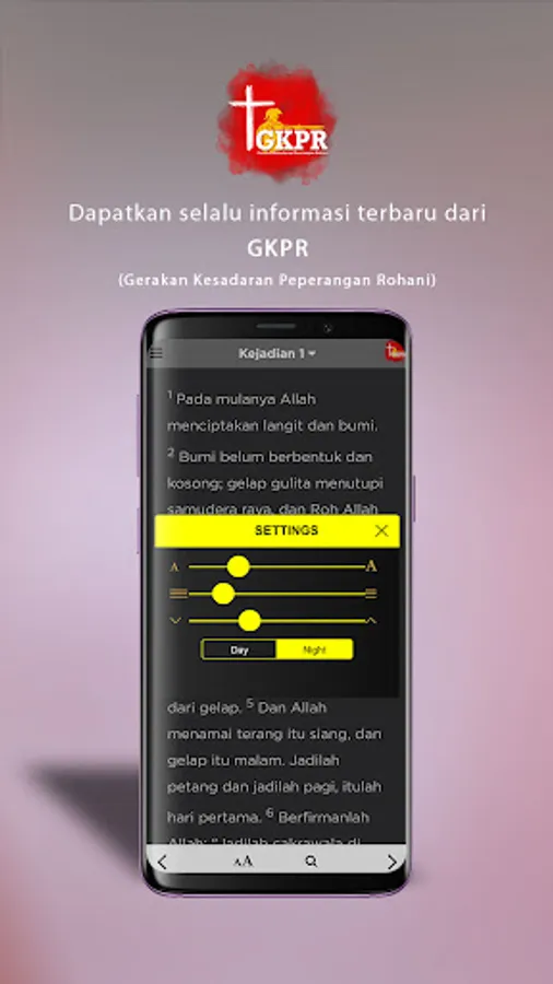 - Bible: keyword search, Easy Reading (Adjust font, text size, and contrast for bright or low-light)