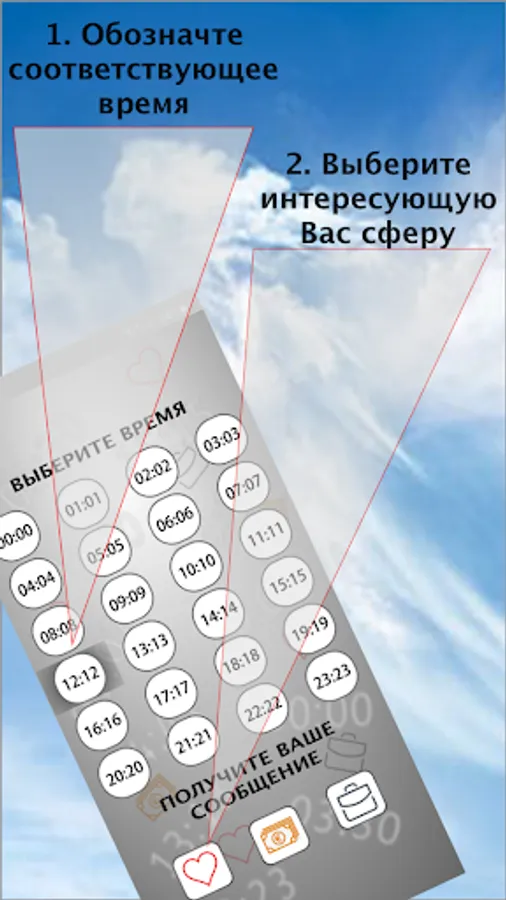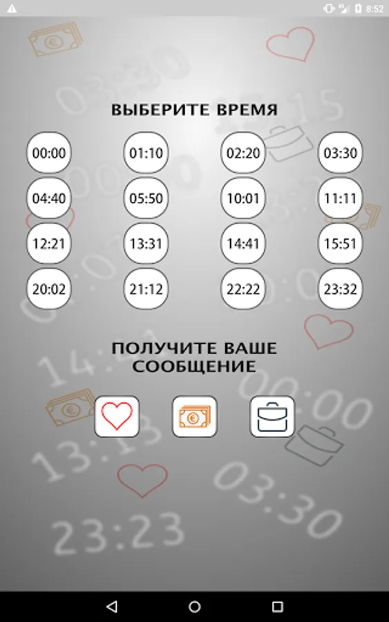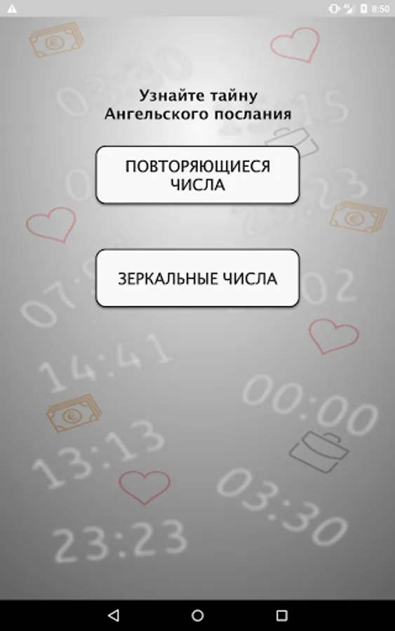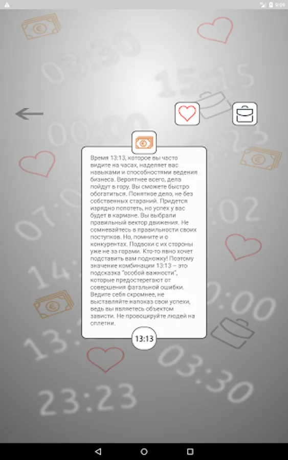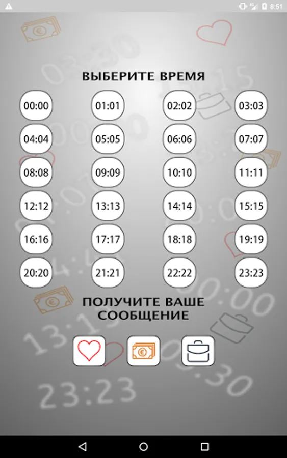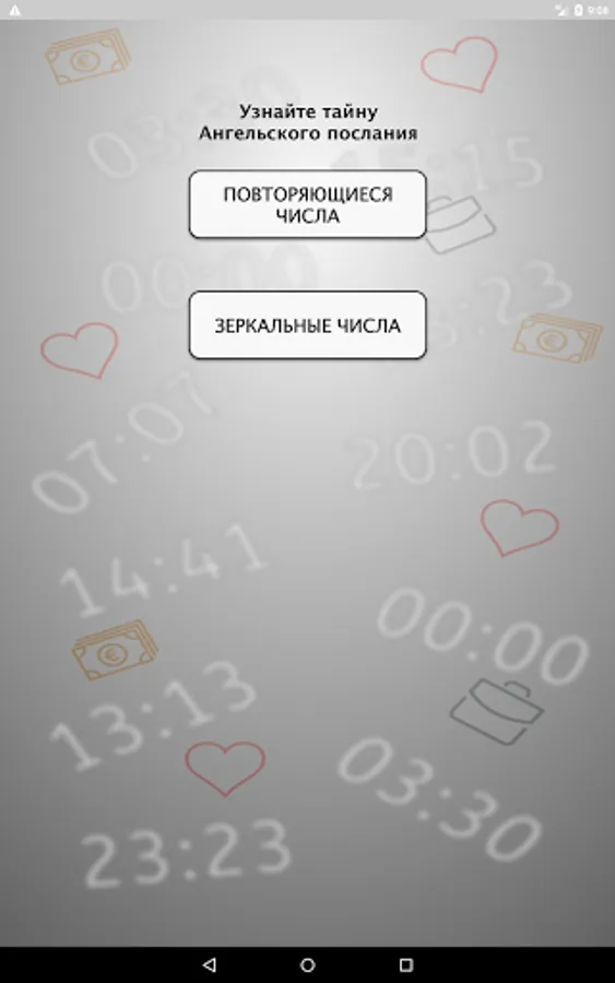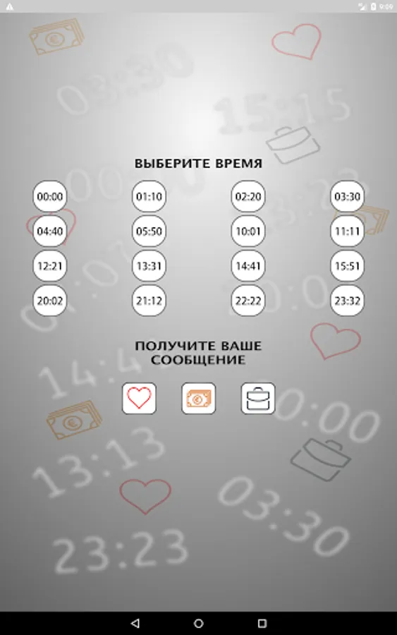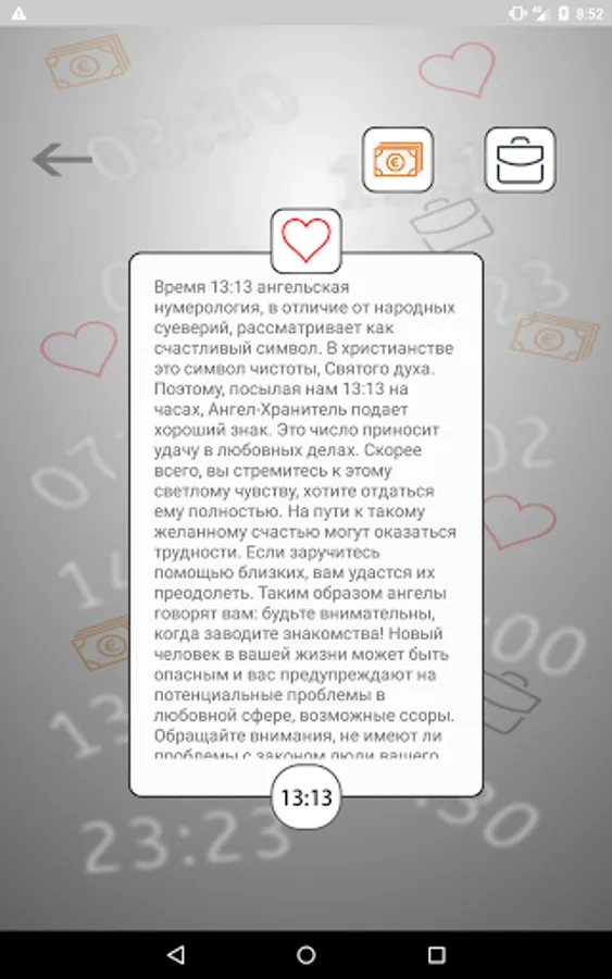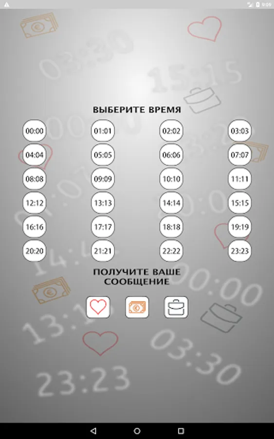 This appendix examines two groups of numbers that you might see on a watch face — repeating numbers, such as 23:23 or 05:05, and mirrored numbers, such as 13:31 or 02:20. According to the time seen, select one of these groups of numbers. After that, a page will open to you where you will choose the time you need and you can immediately find out the content of your message for three areas of life: personal, indicated by the heart, financial, indicated by a pack of bills and business (business, work,