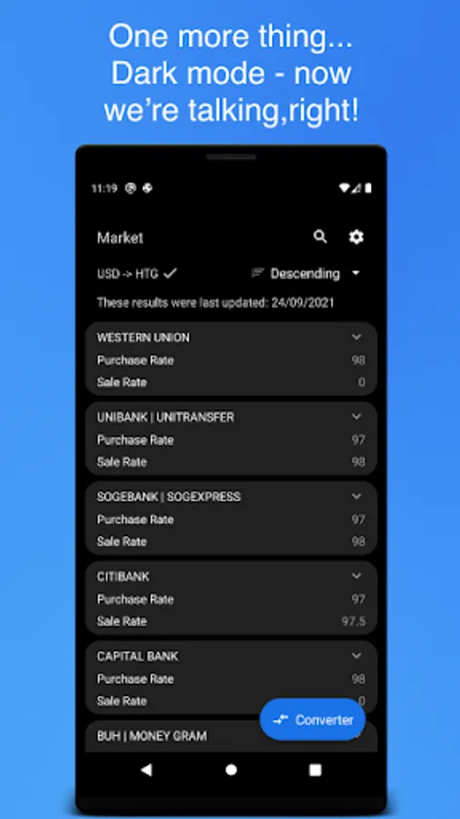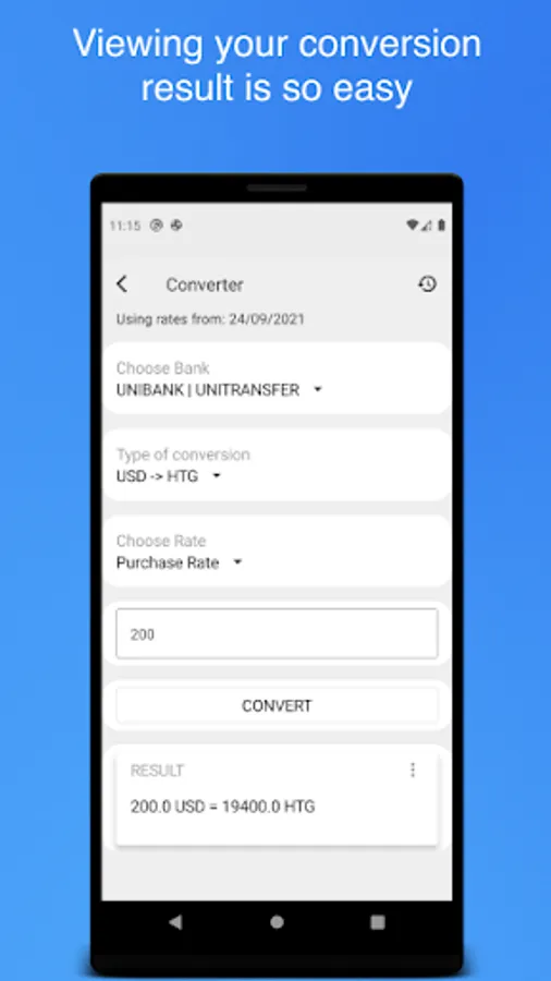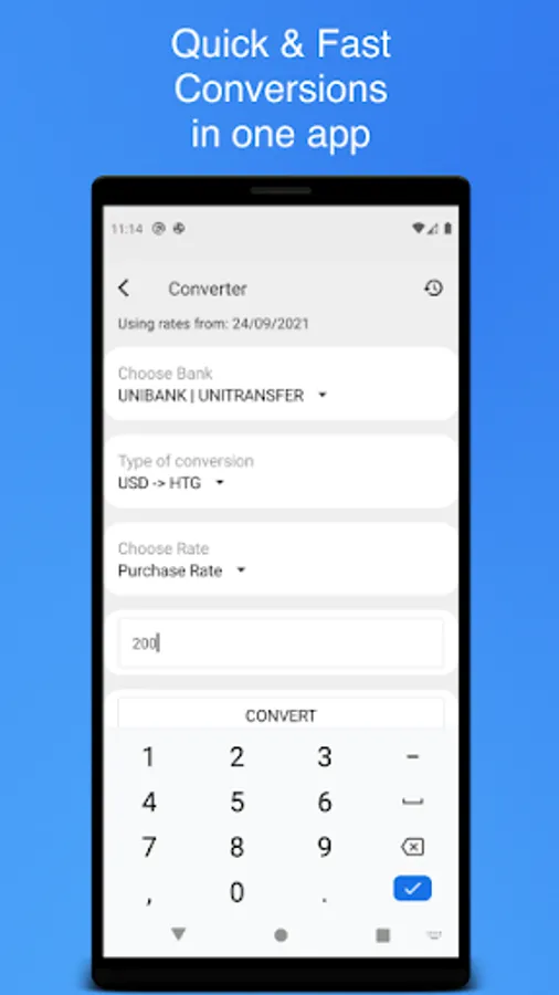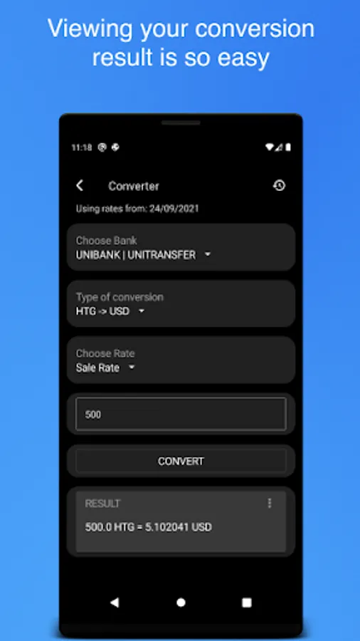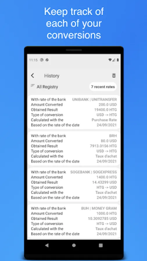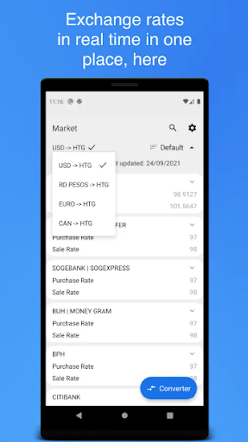 It shows you the exchange rates of banks and some money transfer companies that are partners with haitian banks, and also saves a history of theses rates when there's new exchange rates when you open the app.