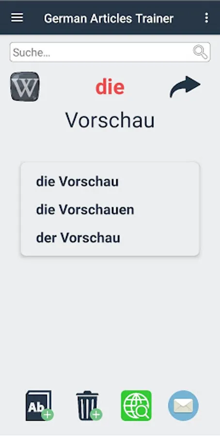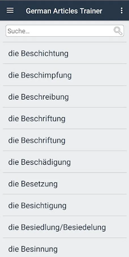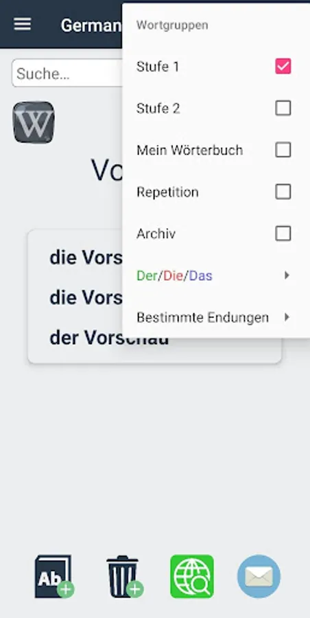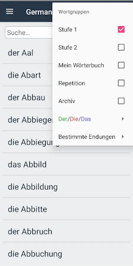 Select the "Test DER DIE DAS" group: "Level 1", "Level 2", "Repetition" or "My dictionary". Wrong solutions go to "repetition".