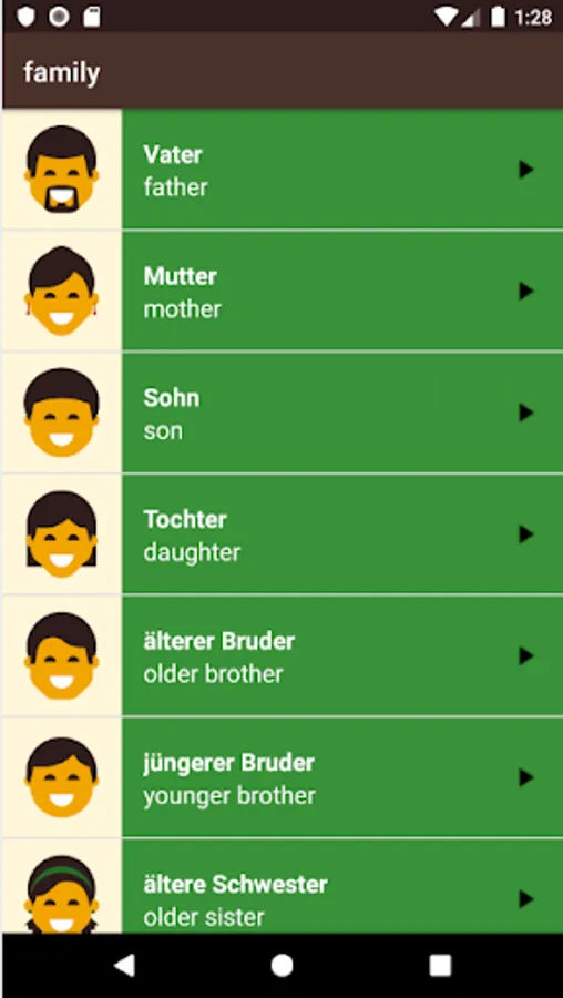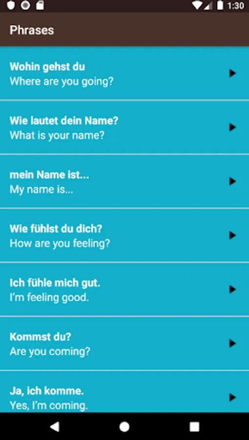 The “Learn the German language” app has many useful German phrases and words (e.g., “Thank you!”, “How much?”). When you tap a phrase, the app speaks it aloud. There is no guessing as to how to pronounce the words. Listen to pronunciation recorded by native German speakers.
