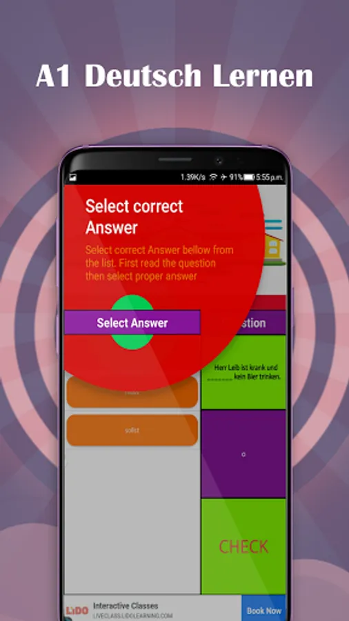 Es ist eine sehr nützliche App für die deutsche Grammatik. Die A1 Deutsch App hat viele Aufgaben mit Beispielen. Es ist eine der besten Multi-Choice-Apps auf Deutsch.