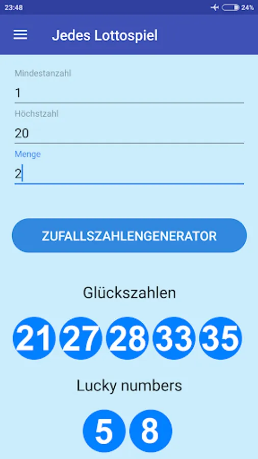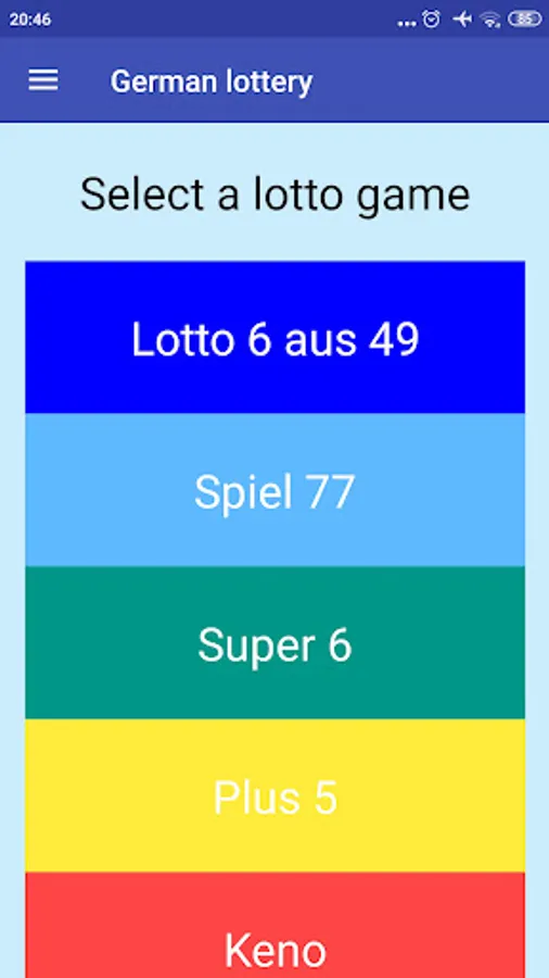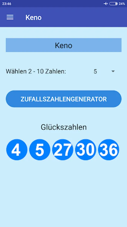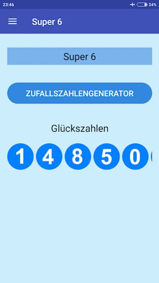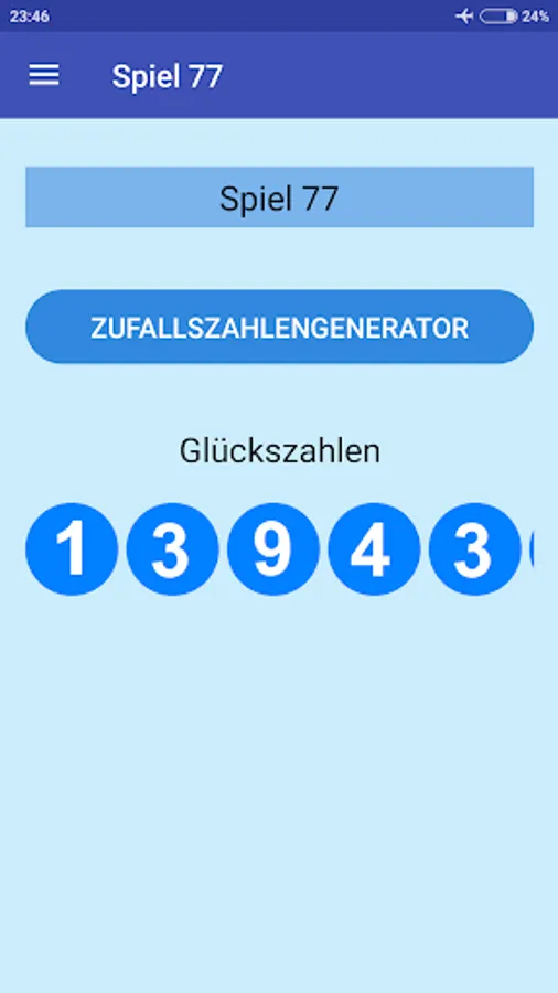 With this free application you can pick random numbers for the Lotto 6 aus 49, Spiel 77, Super 6, Plus 5, Keno, GlucksSpirale and each other lotto game.