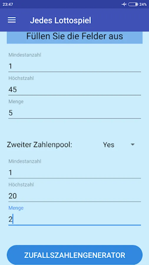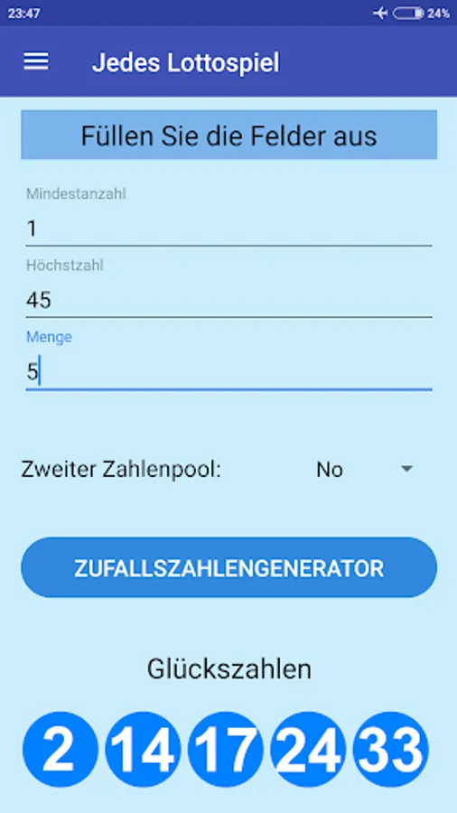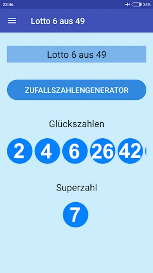 Mit dieser kostenlosen Anwendung Sie konnen Zufallszahlen wahlen fur die Lotto 6 aus 49, Spiel 77, Super 6, Plus 5, Keno, GlucksSpirale und jedes andere Lottospiel.