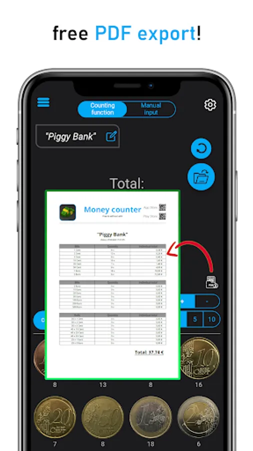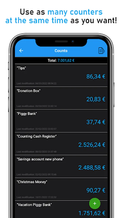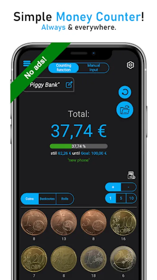 The perfect money counting app. Whether it's the cash register at work or your private piggy bank, this app keeps you on top of everything!