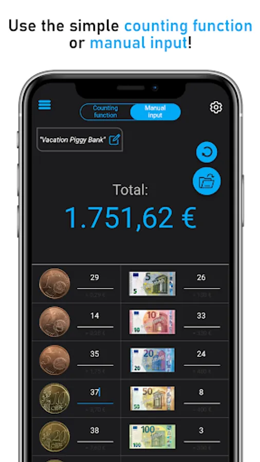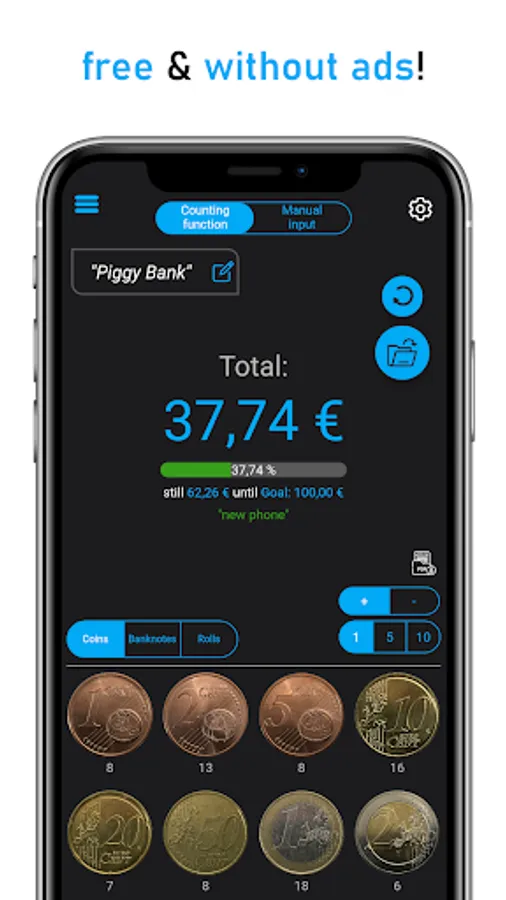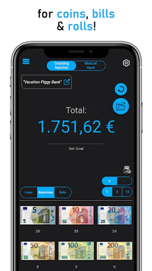 • Choose how many coins / bills you count at once (e.g. "+1" or "+10")
