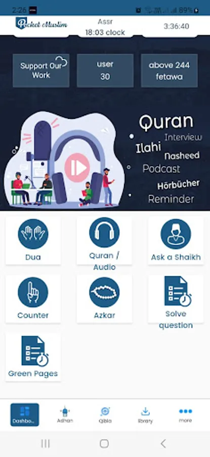 Die App verfügt auch über einen Counter, damit Benutzer ihre Dhikr nach dem Gebet zählen können, ohne sich zu verzählen. Es gibt auch eine Vielzahl von Hörbüchern auf Deutsch und in anderen Sprachen sowie eine Nasheed Rubrik, in der Benutzer islamische Lieder hören und genießen können.