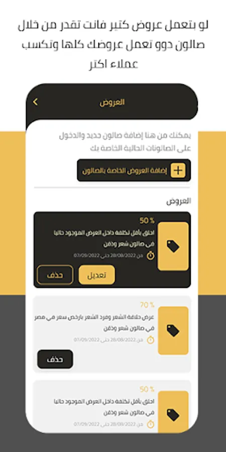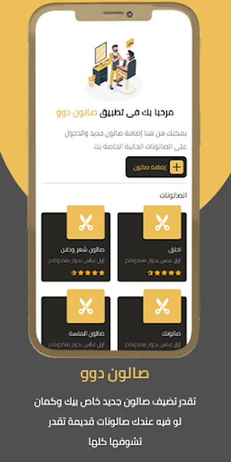 اشهر صالونك وانضمّ إلى أكبر منصّة رقميّة لصالونات الحلاقة والتّجميل في المنطقة لتزيد شهرتك وأرباحك. نظّم مواعيدك وخفّف زحمة الزبائن في الصّالون. أضف عروضك وتخفيضاتك المميّزة لتزيد من رغبة مستخدمي التّطبيق في حجز موعد في صالونك. انضمّ إلى صالونات دوو الآن!