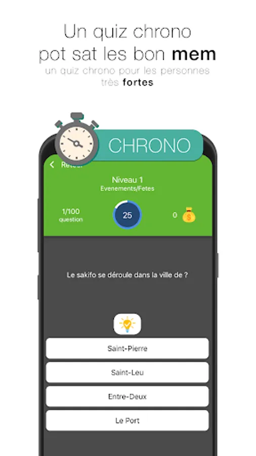 Discover the quiz chrono, the goal to answer as many questions as possible before the end of time, more than 200 questions on the island of Reunion are available.