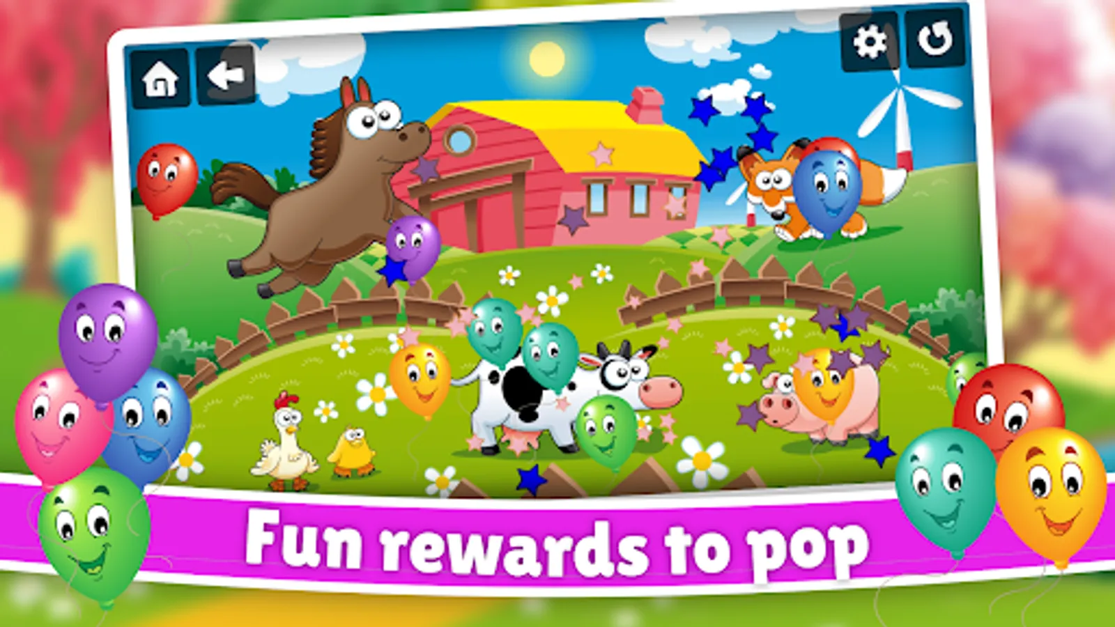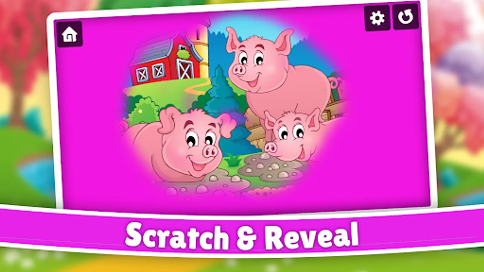 Farm animals reveal and discover for kids is a great game for toddlers. It contains fun, colorful and vivid illustrations of farms and animals, such as cows, pigs, chickens, sheep, horses, donkeys, cats, dogs and much more.
