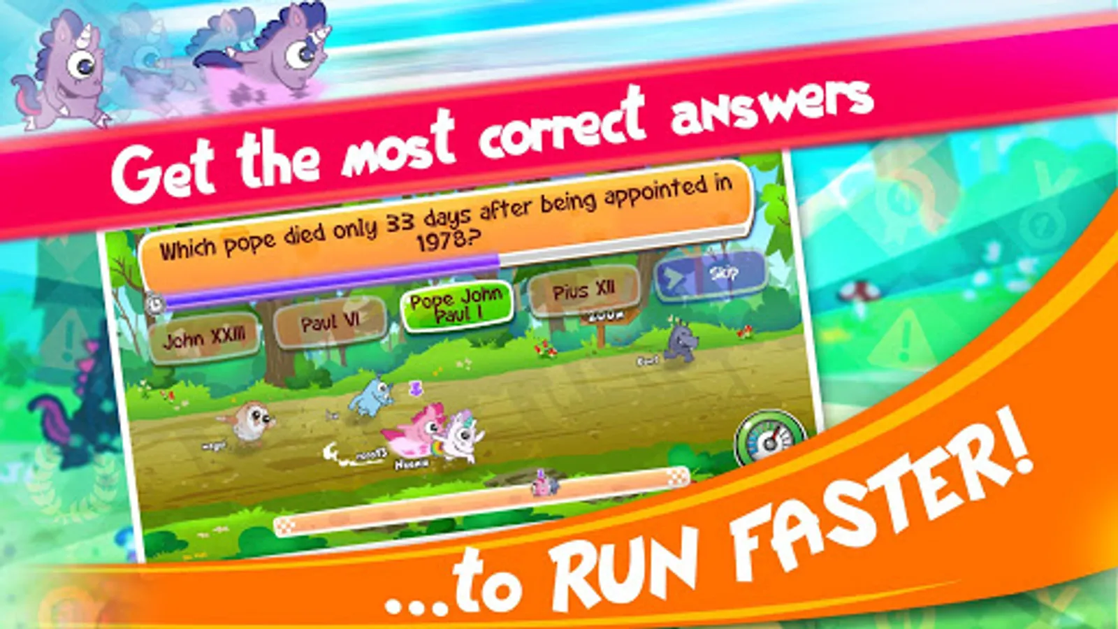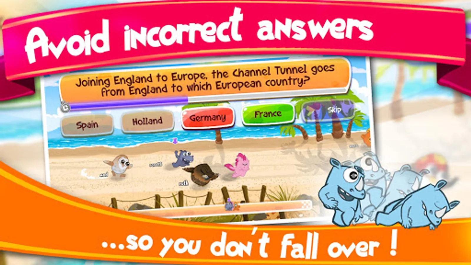 In this race, every correct answer makes your Quizzy more excited and speeds them up. A wrong answer makes them depressed and fall over!
