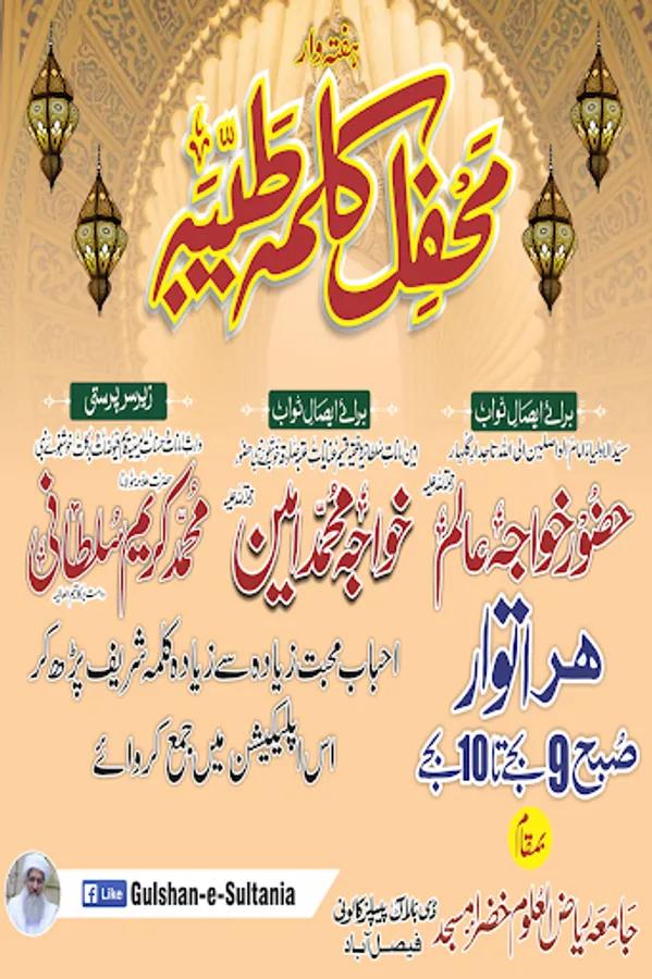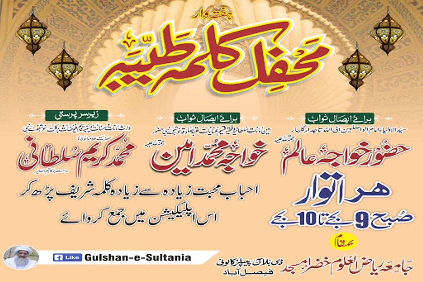 جامعہ ریاض العلوم مسجد خضراء پیپلزکالونی ڈی بلاک فیصل آباد میں ہفتہ وار محفل کلمہ طیبہ کا انعقاد کیا جاتا ہے احباب محبت جو کلمہ طیبہ پڑھتے ہیں وہ اس میں جمع کرواتے ہیں جو بزرگان دین ، حاضرین اور کلمہ طیبہ پڑھ کر جمع کروانے والوں کے لواحقین کو بھی ایصال ثواب کیا جاتا ہے اورتمام کی دین و دنیا کی بھلائی کیلئے بھی دعا کی جاتی ہے۔ بیرون ملک یا دوسرے شہر سے تعلق رکھنے والے افرادکی سہولت کیلئے گلشن سلطانیہ سوشل میڈیا ٹیم کی جانب سے یہ ایپلی کیشن متعارف کروائی گئی ہے جس میں آپ اپنا پڑھا ہوا کلمہ طیبہ جمع کروا سکتے ہیں ۔ اللہ تعالیٰ ہم سب کو زیادہ سے زیادہ کلمہ شریف پڑھنے کی توفیق عطا فرمائے۔