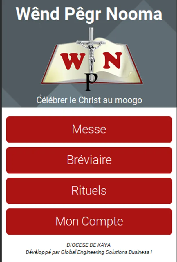 Wend Pegr Nooma (WPN) is an application for Catholic faithful who speak the Mooré language (Ethnicity of Burkina Faso). The application offers: