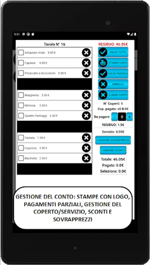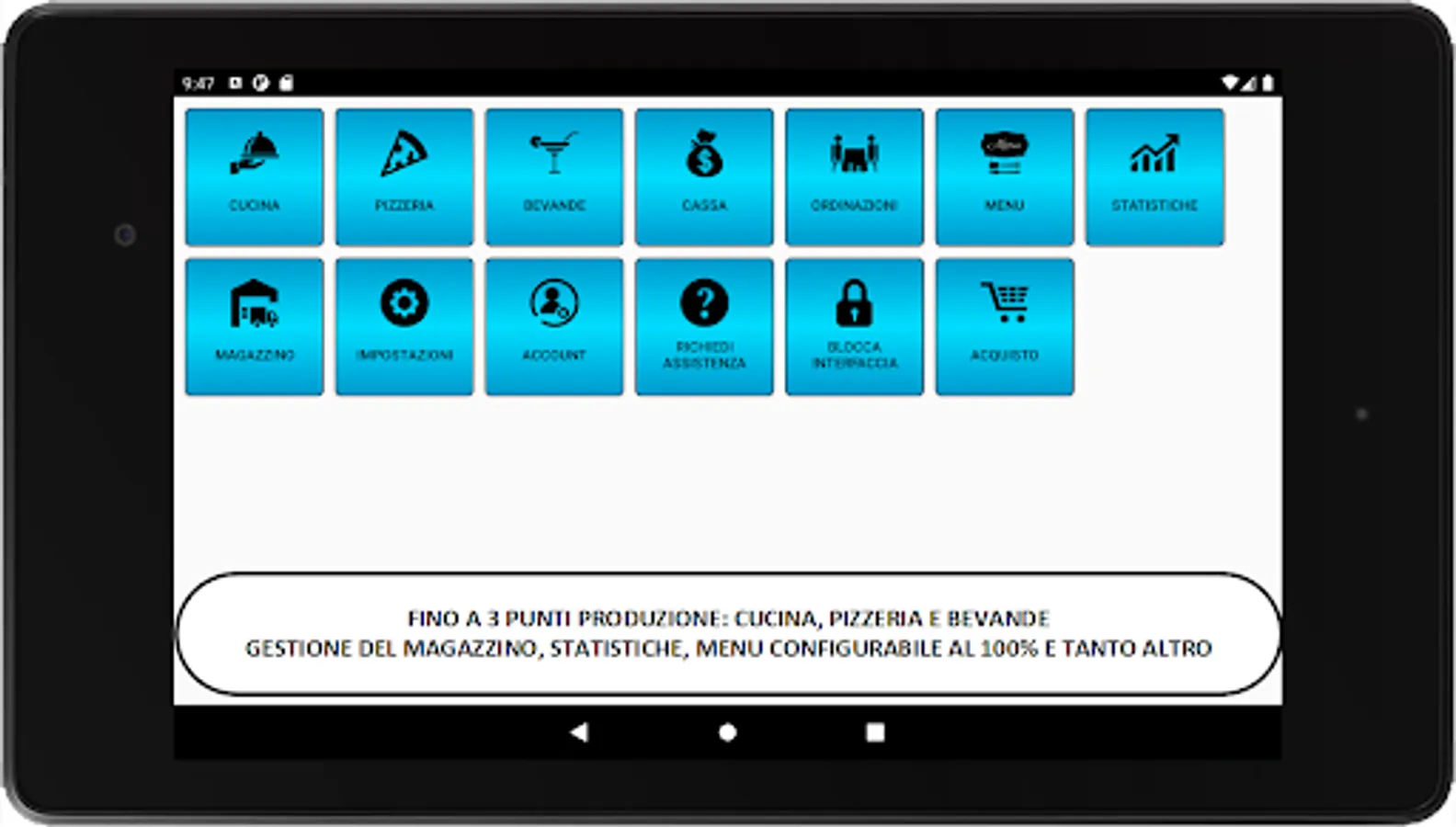 ✔️ The " Commands Pro - Tablet " app from which it is also possible to manage orders and accounts from the "Kitchen", "Pizzeria", "Beverages" and "Cash" interfaces.