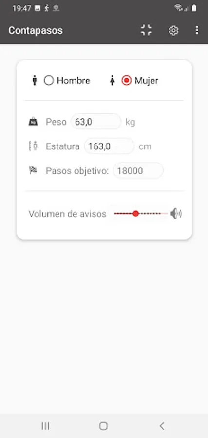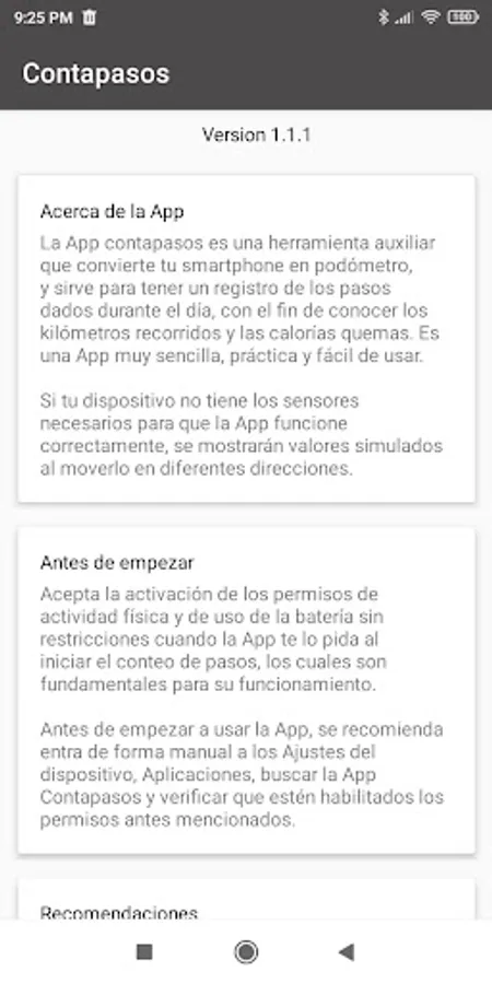 The Contapasos App is an auxiliary tool to keep track of the number of steps taken during the day, calculate the kilometers traveled and the calories burned.