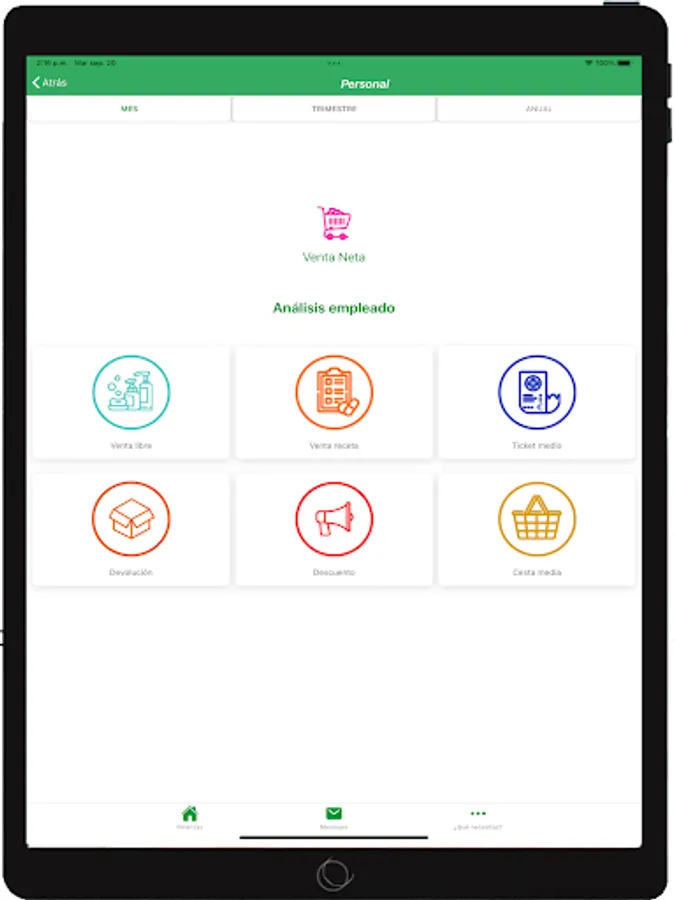 With the Monmarketing app you will be informed of the day to day of your pharmacy, it provides data on boxes, sales, purchases, warehouse and personnel, as well as an analysis of the evolution of your business.