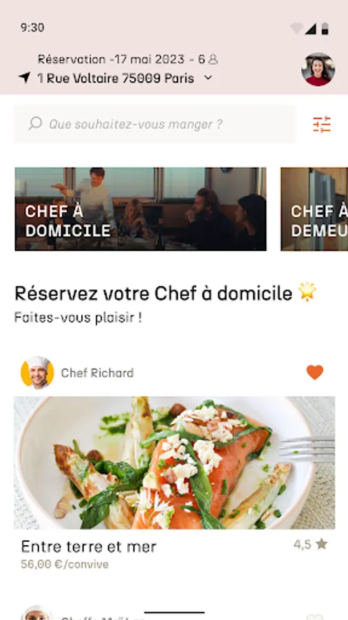 Chef at home: Download the application, choose the address, the date and the style of cooking for your service. Once you have found an available Chef offering a menu adapted to your desires, all you have to do is pay in full or split it with your guests. The Chef will come directly to the place on the date chosen during your reservation, he will carry out your service including: cooking, service and storage.