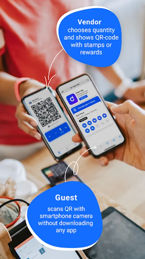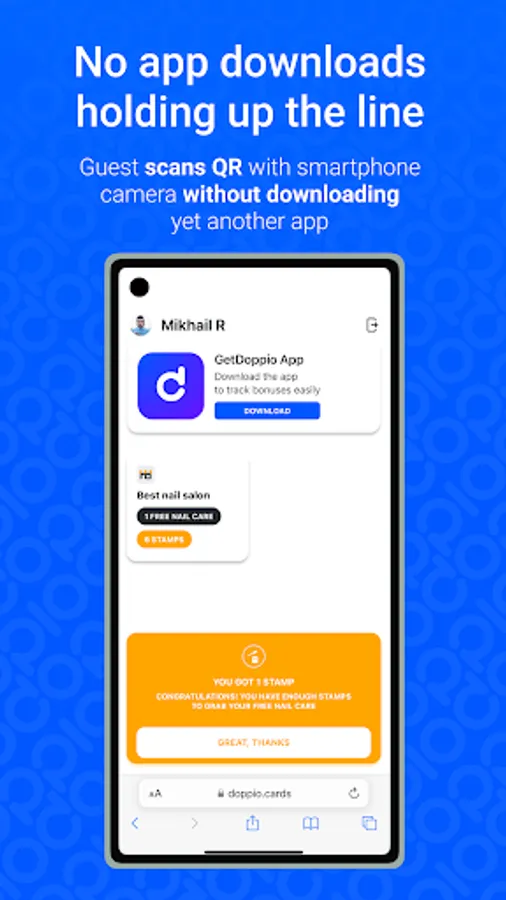 Simply use your phone or POS device to generate a doppio QR code, and have your guests scan this code to collect stamps. They don't need to download the app, as any web browser and smartphone camera will work. When a guest has enough stamps for a reward, they scan the reward QR code.