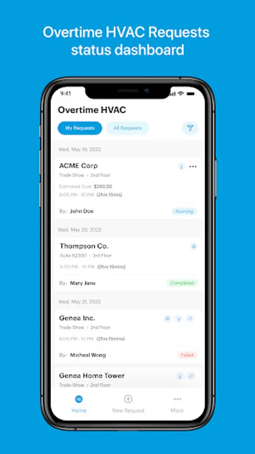 Our Overtime HVAC service enables tenants to conveniently procure after hours HVAC and lights via their smartphone, tablet, personal computer, or telephone. Genea Overtime HVAC automates all aspects of an after hours request including request confirmation, fulfillment, invoice approval and integration into accounting systems. Offering tenants convenient access to after hours HVAC and lights through Overtime HVAC allows buildings to be more energy efficient by defaulting to being turned down during lower occupancy lease hours. Our 24/7 staff ensures that tenants are taken care of.