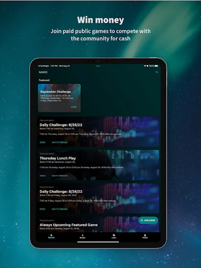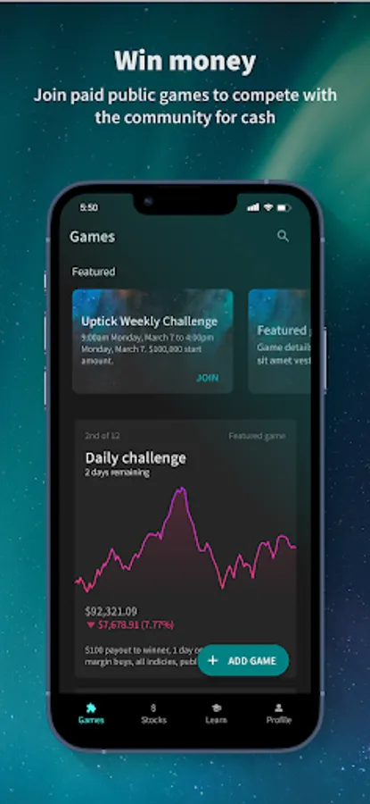 UpTick is a Fantasy Stock Trading app that is a blend of social competition with opportunities to learn about investing. Through our unique model you can win cash prizes based on your investing results, at no cost to you.