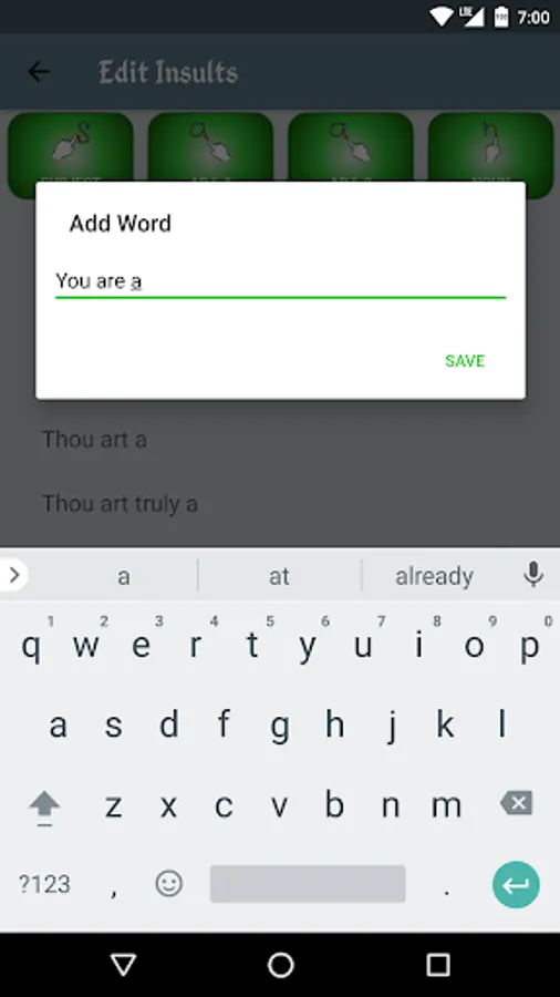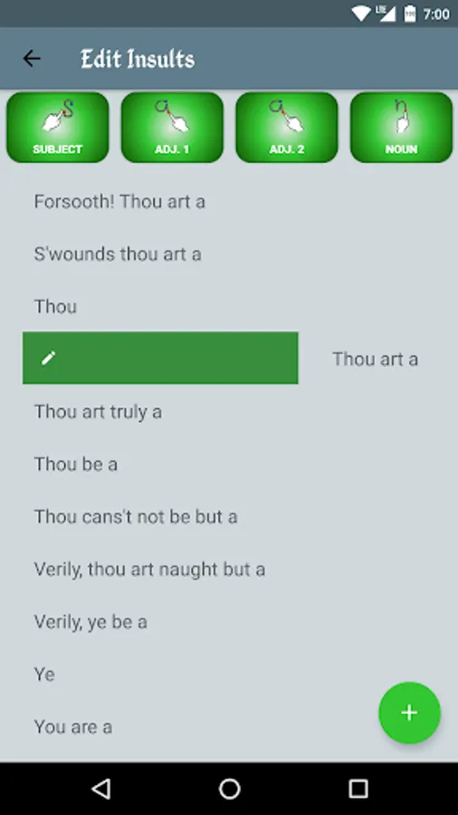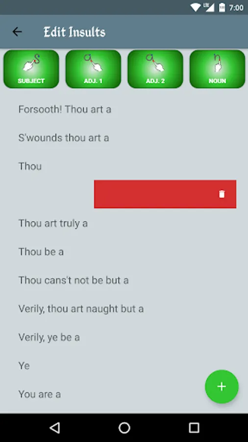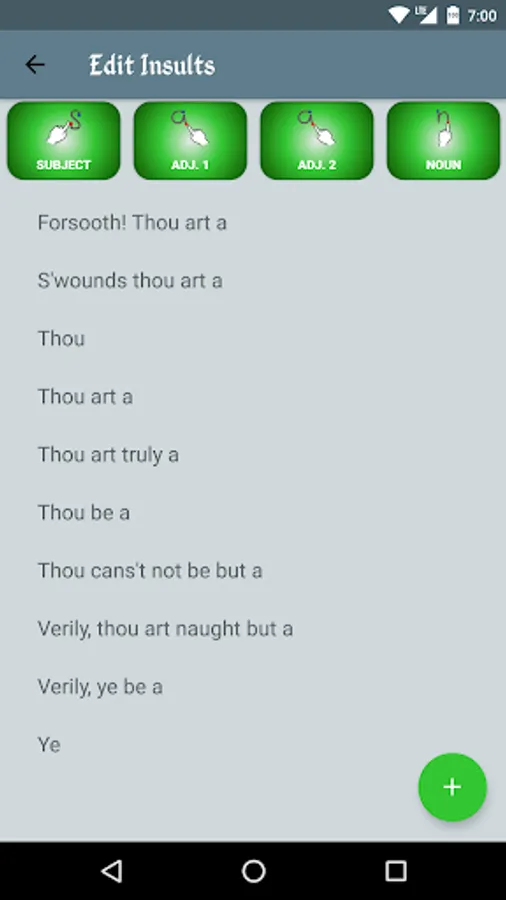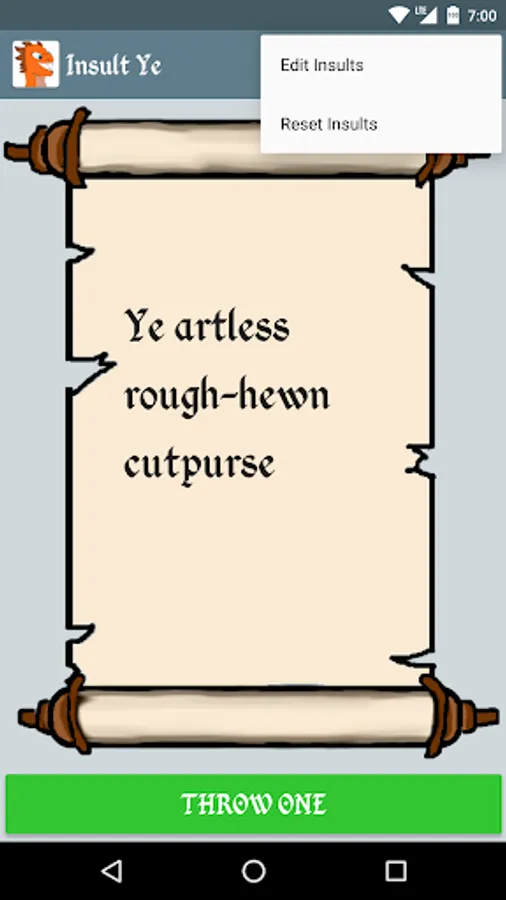 Never again be without an insult during a disagreement or rowdy role-playing game. Have an insult ready to throw using words from the renaissance era. Swipe left/right on words to customize the insults or add your own for unlimited possibilities.