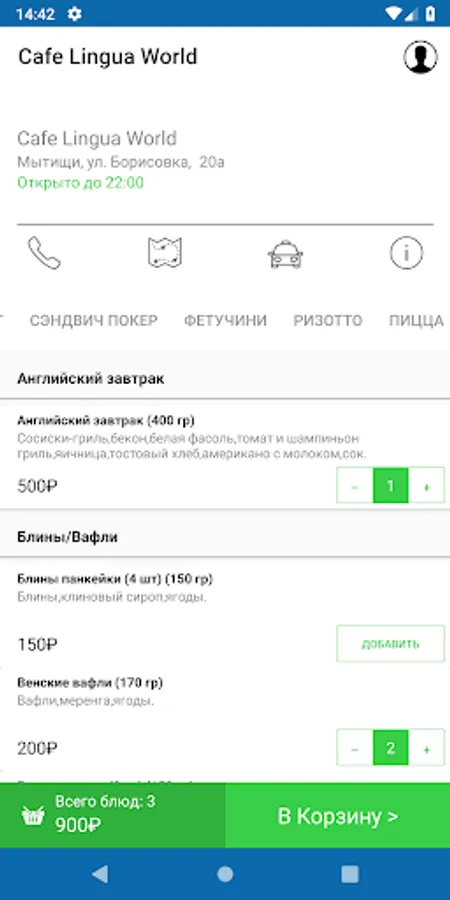 When you are hungry, the last thing you want to do is wait for your order. With the Lingua World app, it’s much easier to pre-order and pay a check at a cafe. All you need to do is select dishes from photographs, specify the time of serving and send a request to the restaurant. The waiter will take the order with one click and the table will be set for your arrival. Push notifications will allow you to keep track of what stage your order is at. Enjoy your meal! No waiting!