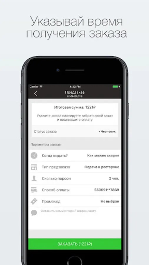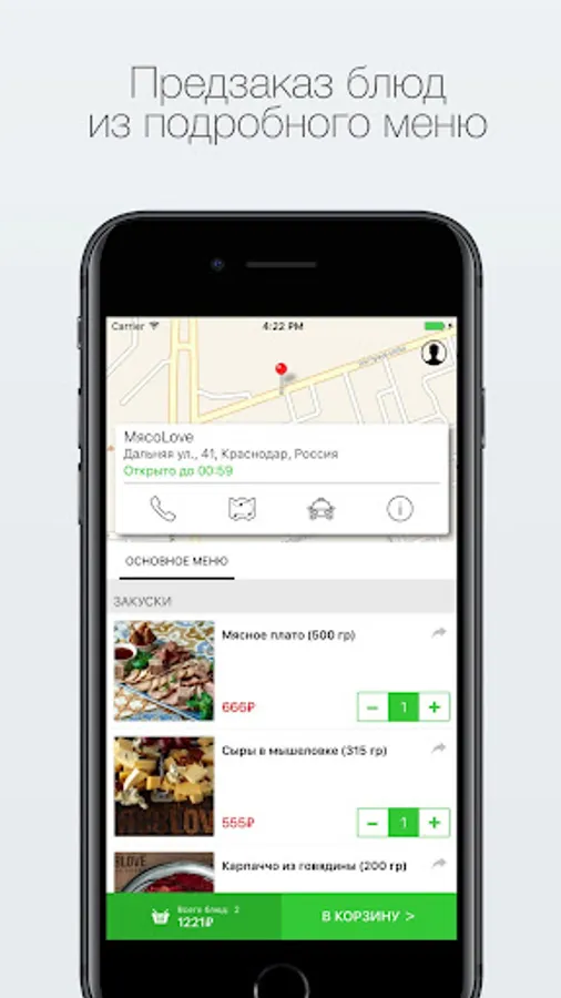 When you are hungry, the last thing you want to do is wait for your order. With the Meat Love app, pre-ordering and paying for a check at your favorite restaurant is much easier. All you need to do is select dishes from photographs, indicate the time of filing and send a request to the restaurant. The waiter will accept the order with one click and the table will be set at your arrival. Also, using the Meat Love app, you can order takeaway dishes - this will help to save a lot of time and not leave your car for a long time. Push notifications allow you to monitor at what stage your order is. Bon Appetit! No waiting!