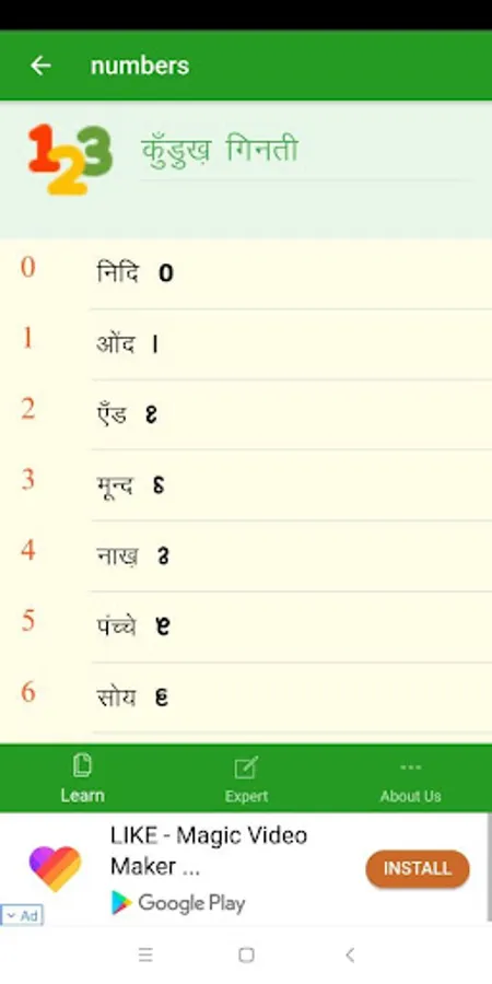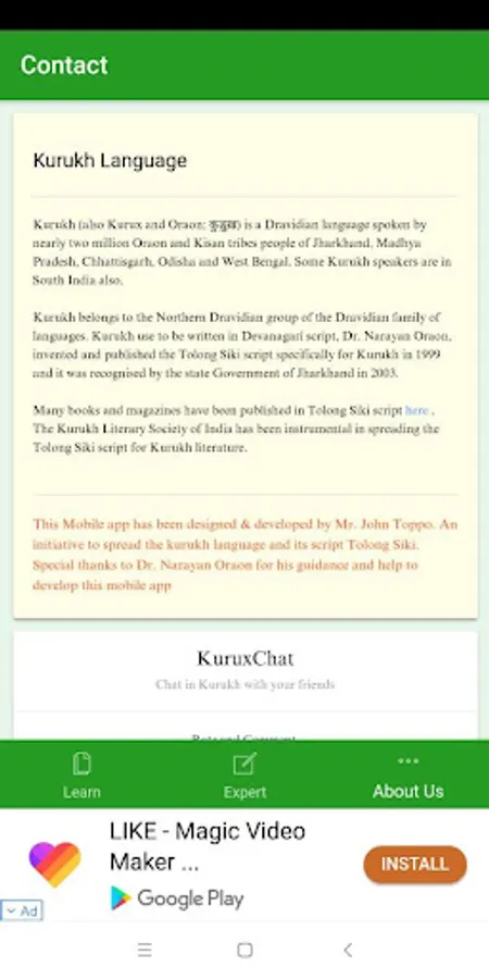 This app helps to learn speaking Kurukh and writing using its script/Lipi Tolong Siki.