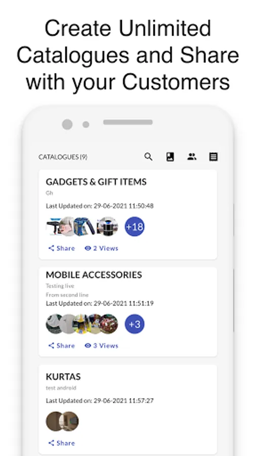 Create unlimited catalogues by just uploading products photo from your phone gallery, camera or existing products. It’s just as simple as uploading photos to social networking apps.