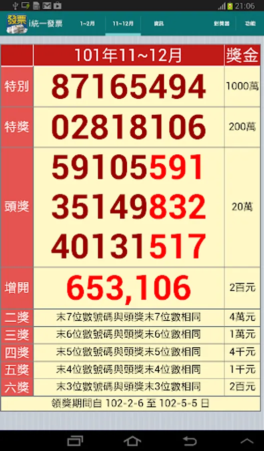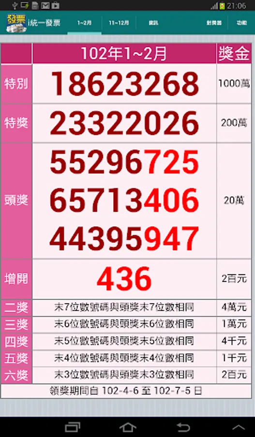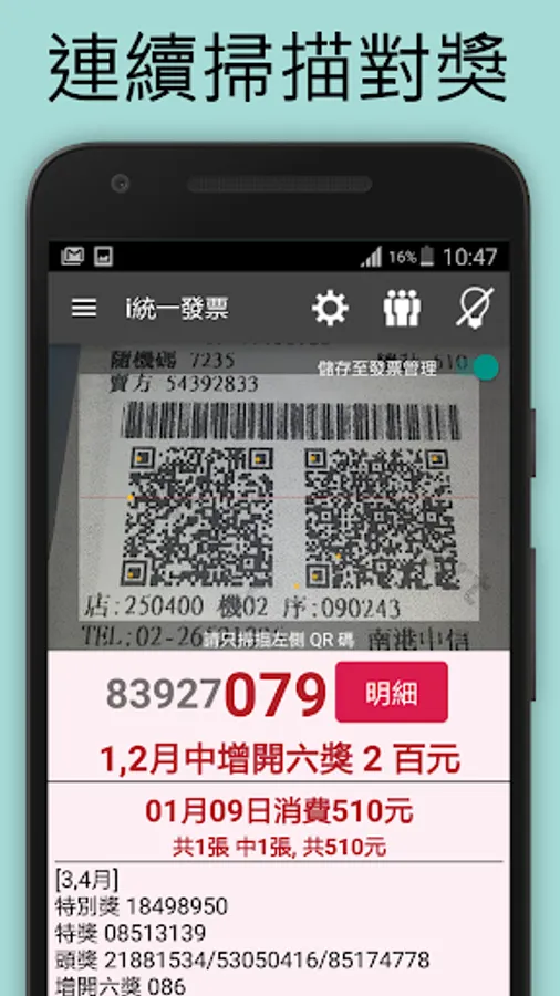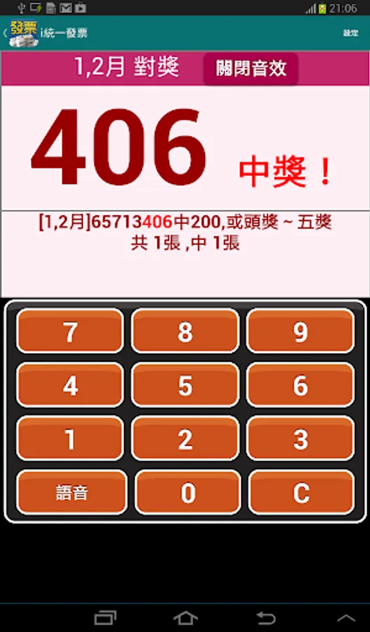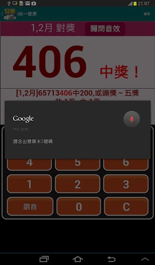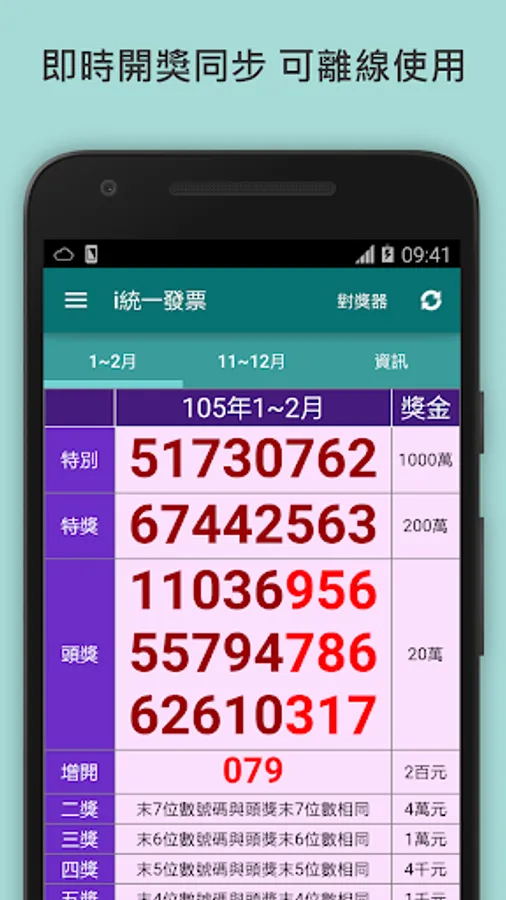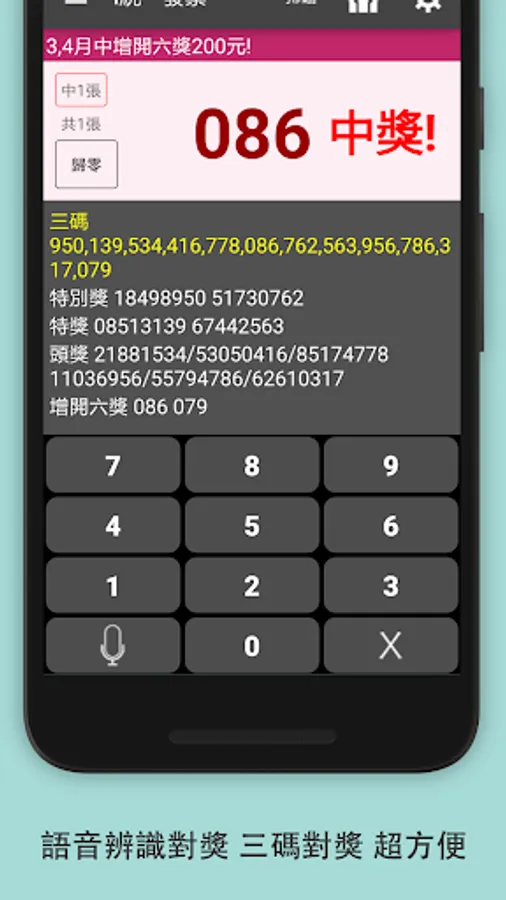 Enter the last 3 codes of the invoice, and the voice prompt will match the prize. You can check the prize number for 4 months offline once. (The voice prompt can be turned off in the settings)