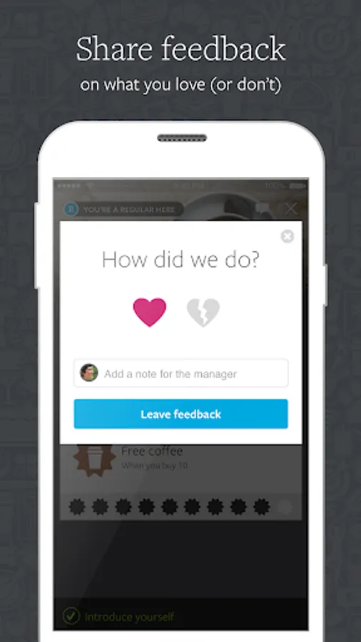 We designed Clover to be fast, friendly, and out of the way. When you check into one of your favorite spots, Clover lets the merchant know that you're in the house. Just mention your first name when you make a purchase, and you'll be on your way to earning perks — no punch cards to remember to bring, scanning of codes, or fussing with gadgets at the counter.