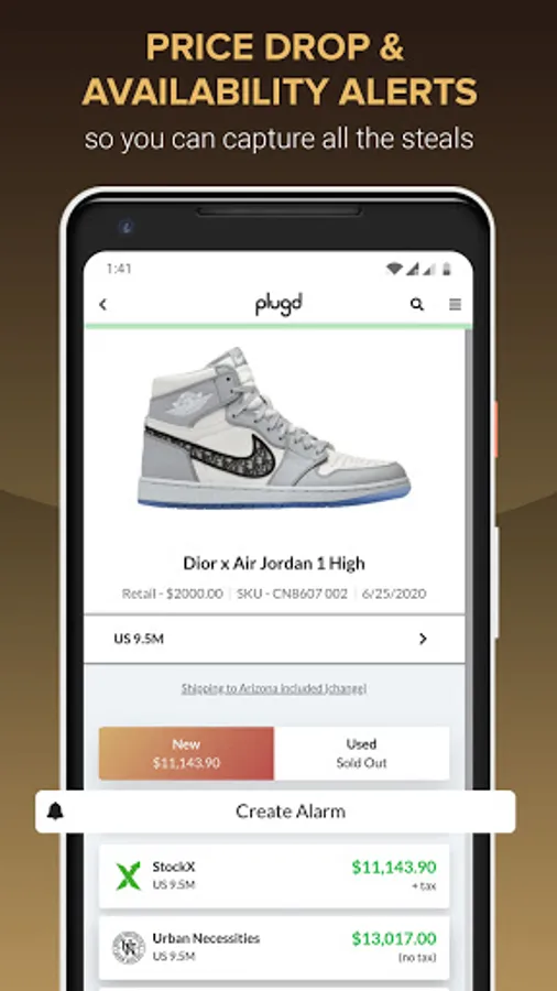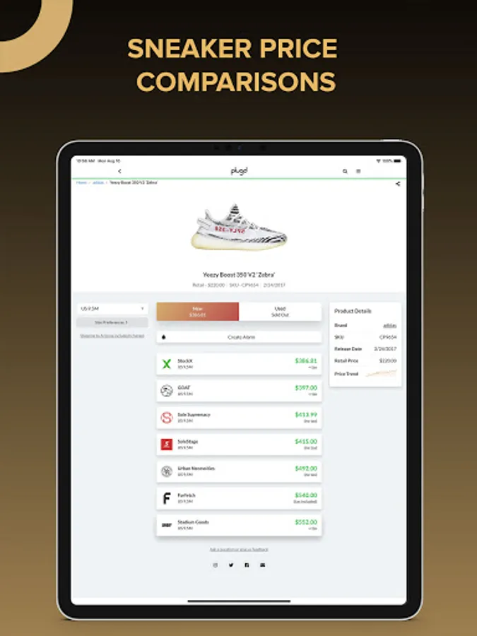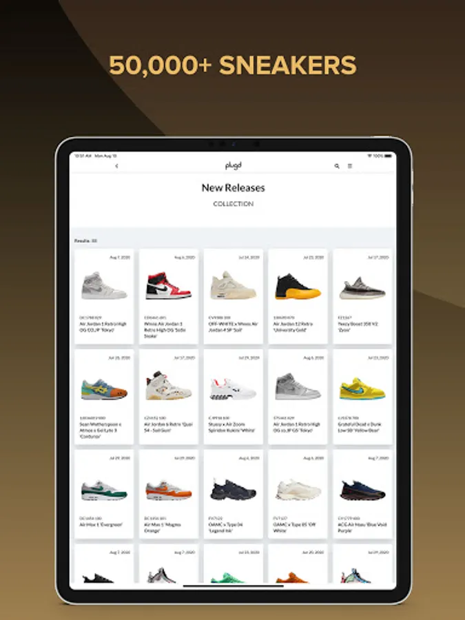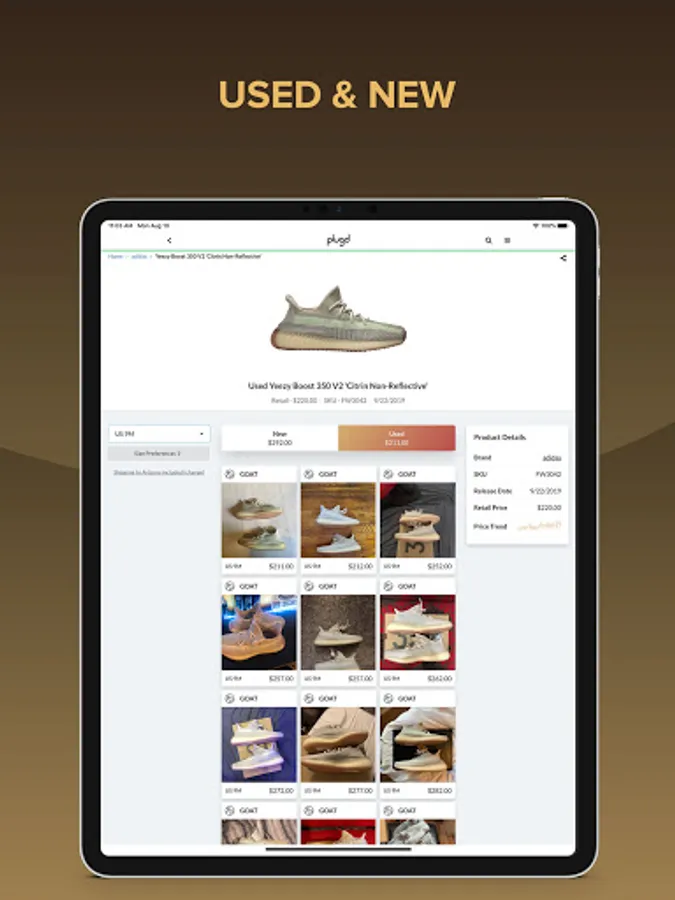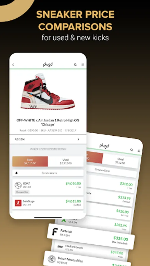 Plugd gives you access to the largest inventory and pricing database of pre-verified authentic new & used sneakers from Nike, Adidas, New Balance, and more. Plugd digs up real-time pricing, inventory, shipping, and tax information for both new & used sneakers from marketplaces and stores like Goat, StockX, Stadium Goods, and even eBay.