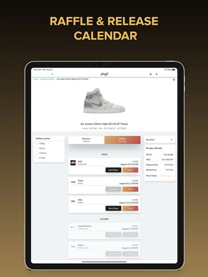 Get up-to-date launch information on all the latest hyped sneaker drops and releases. Plugd is Integrated with over 100 retailers to notify you on drop information so you can maximize your chances of copping sneakers for retail! The store list includes SNKRS, Adidas Confirmed, Yeezy Supply, Nice Kicks, END, Nordstrom, and more.