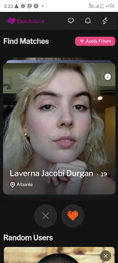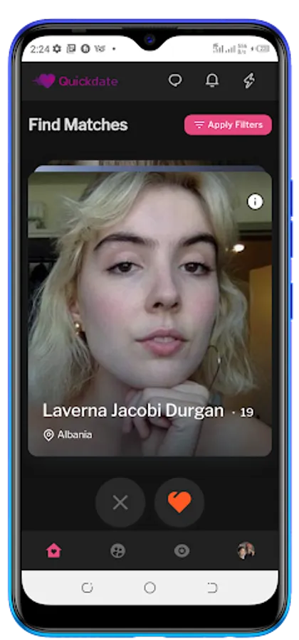 Quickdate is an online dating and geosocial networking application. In Quickdate, users "swipe right" to like or "swipe left" to dislike other users' profiles, which include their photos, a short bio, and a list of their interests. Quickdate uses a "double opt-in" system where both users must like each other before they can exchange messages. Quickdate was launched in 2022, Quickdate was registering about one million daily "swipes" and reported that users logged into the app on average 11 times a day. In 2022, Quickdate was the fifth highest-grossing mobile app, Quickdate had 1.2 million subscribers and 25 million monthly visits. As of 2023, Quickdate has recorded more than 65 million matches worldwide.