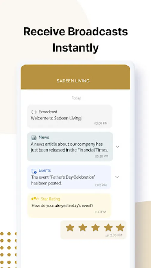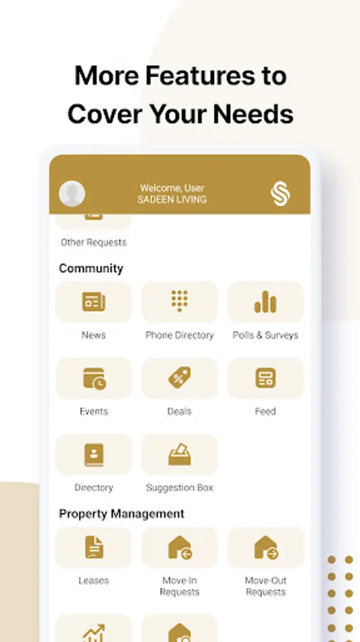 كما يأتي تطبيق SADEEN LIVING ليكون منصة تفاعلية مميزة بين قاطني المجمع السكني الواحد والاطلاع على الأنشطة التي تدور حولهم وتبادل الصور والمقاطع و الاستماع الى الأراء والإقتراحات بكل بساطة يمكن لتطبيق SADEEN LIVING ان يتضمن على اي خدمة او حاجة للساكن.