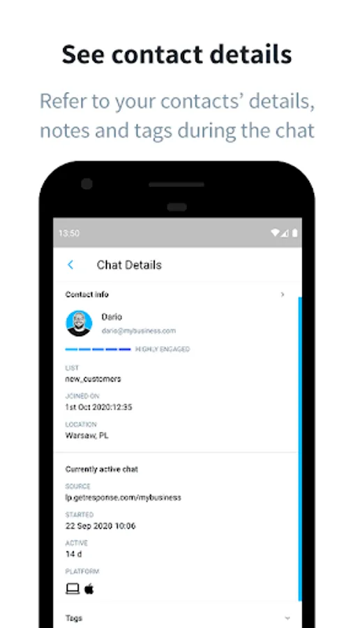 See contact details – Refer to your contacts’ details, notes and tags during the chat
